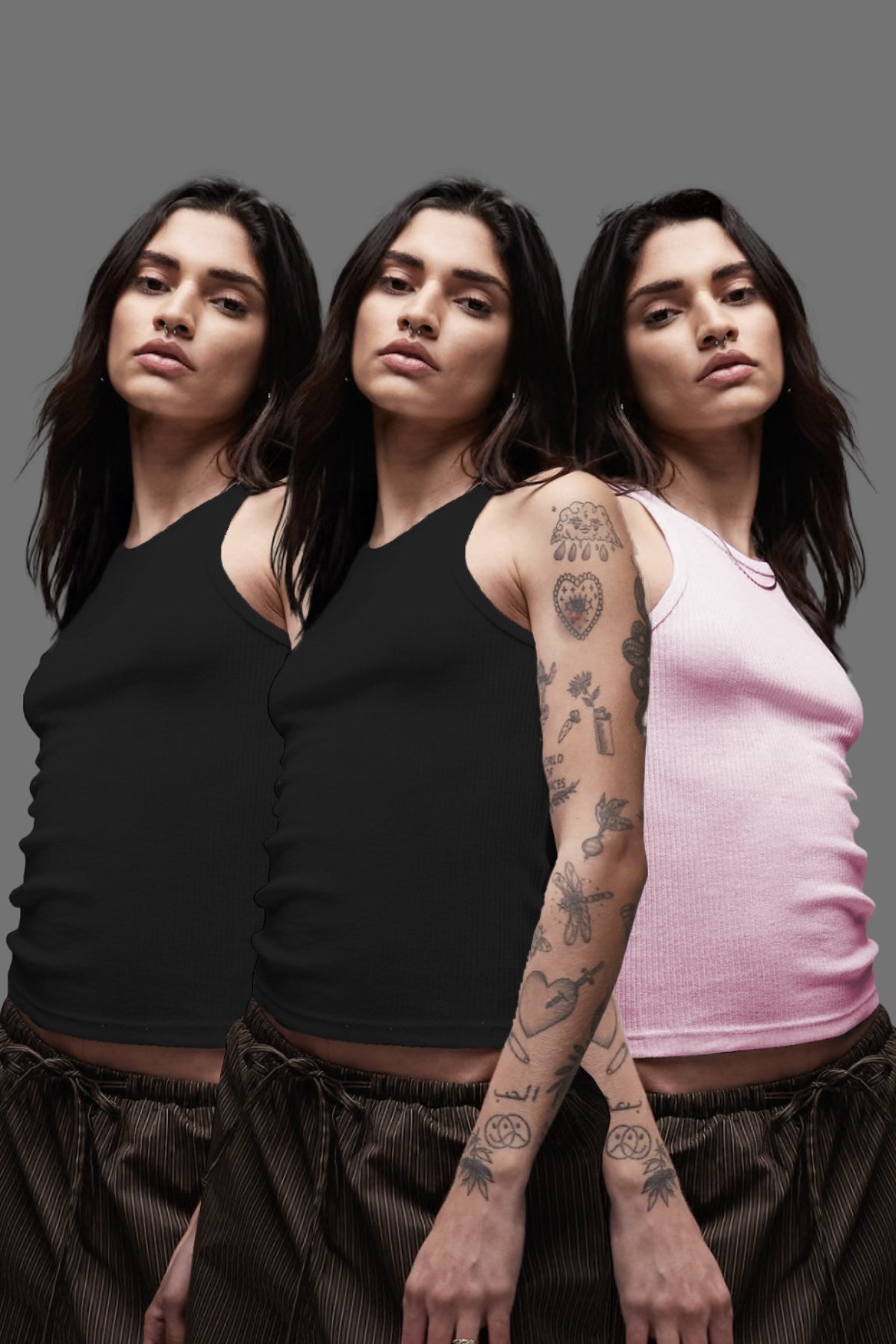 3'lü Kadın Kaşkorse Atlet Takımı – Siyah Siyah Pembe Renkli Ribana Atlet