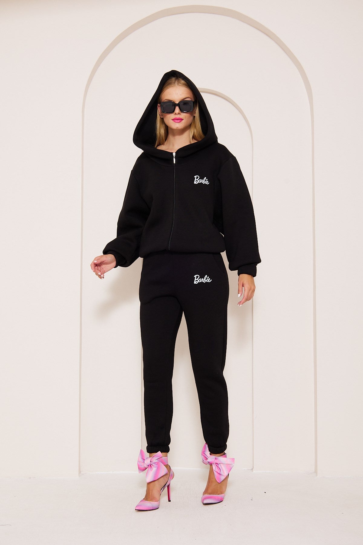 Kadın Siyah Pembe Yazı Baskılı 3’lü Eşofman Takımı – Fermuarlı Kapüşonlu , Atlet Body