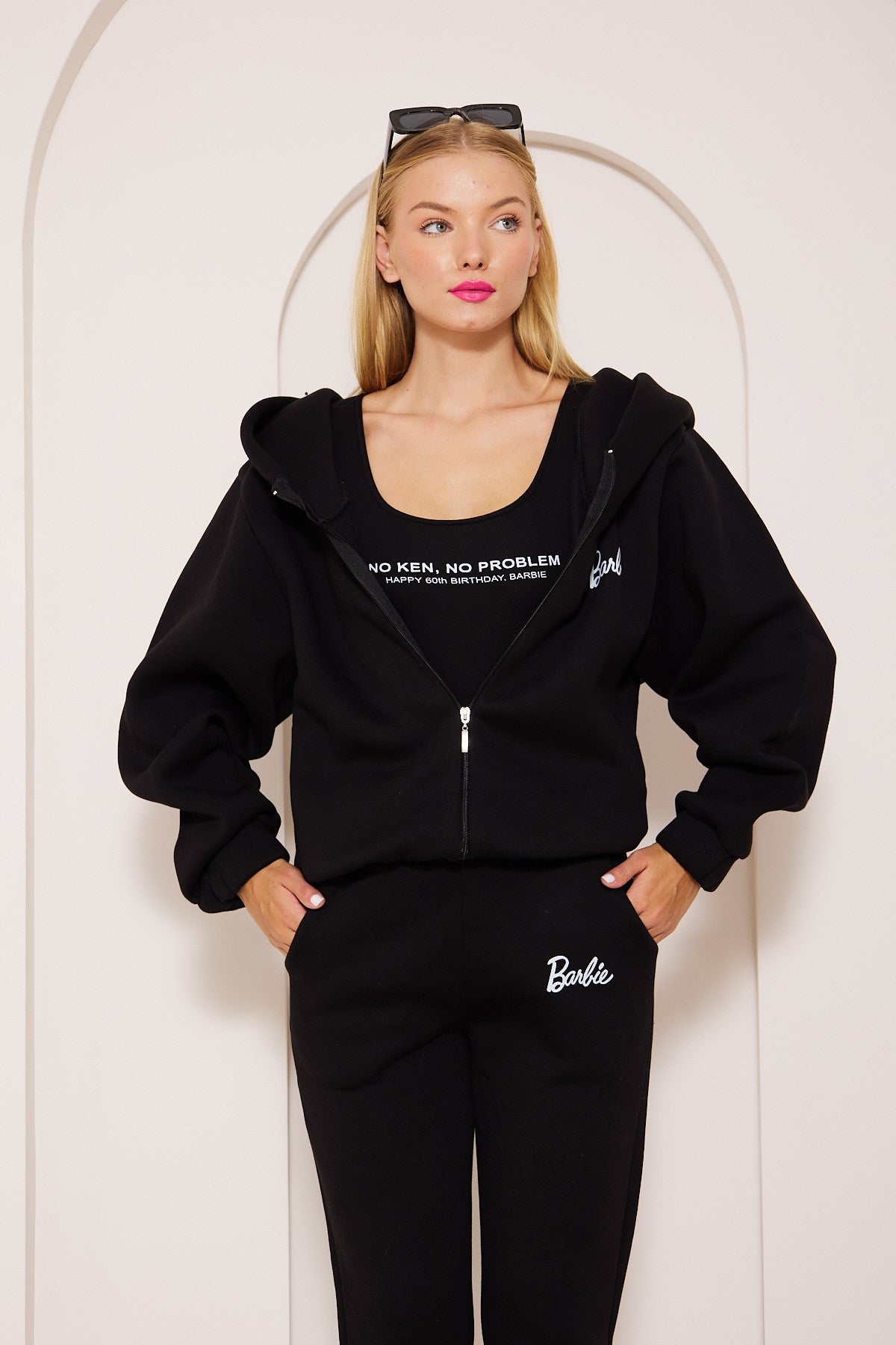 Kadın Siyah Pembe Yazı Baskılı 3’lü Eşofman Takımı – Fermuarlı Kapüşonlu , Atlet Body - SİYAH / S