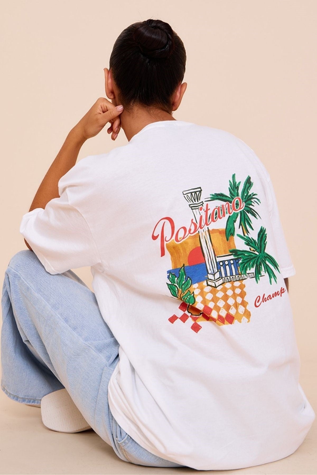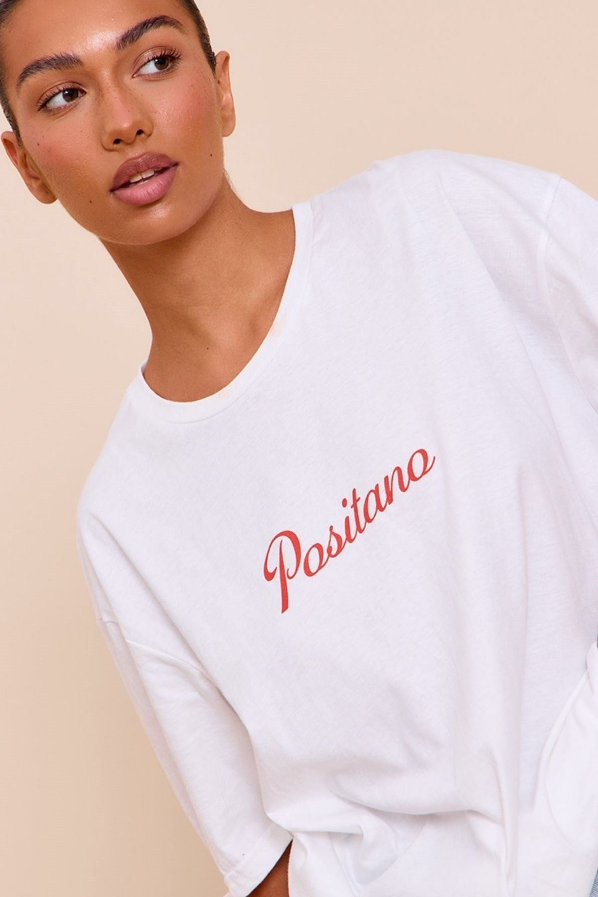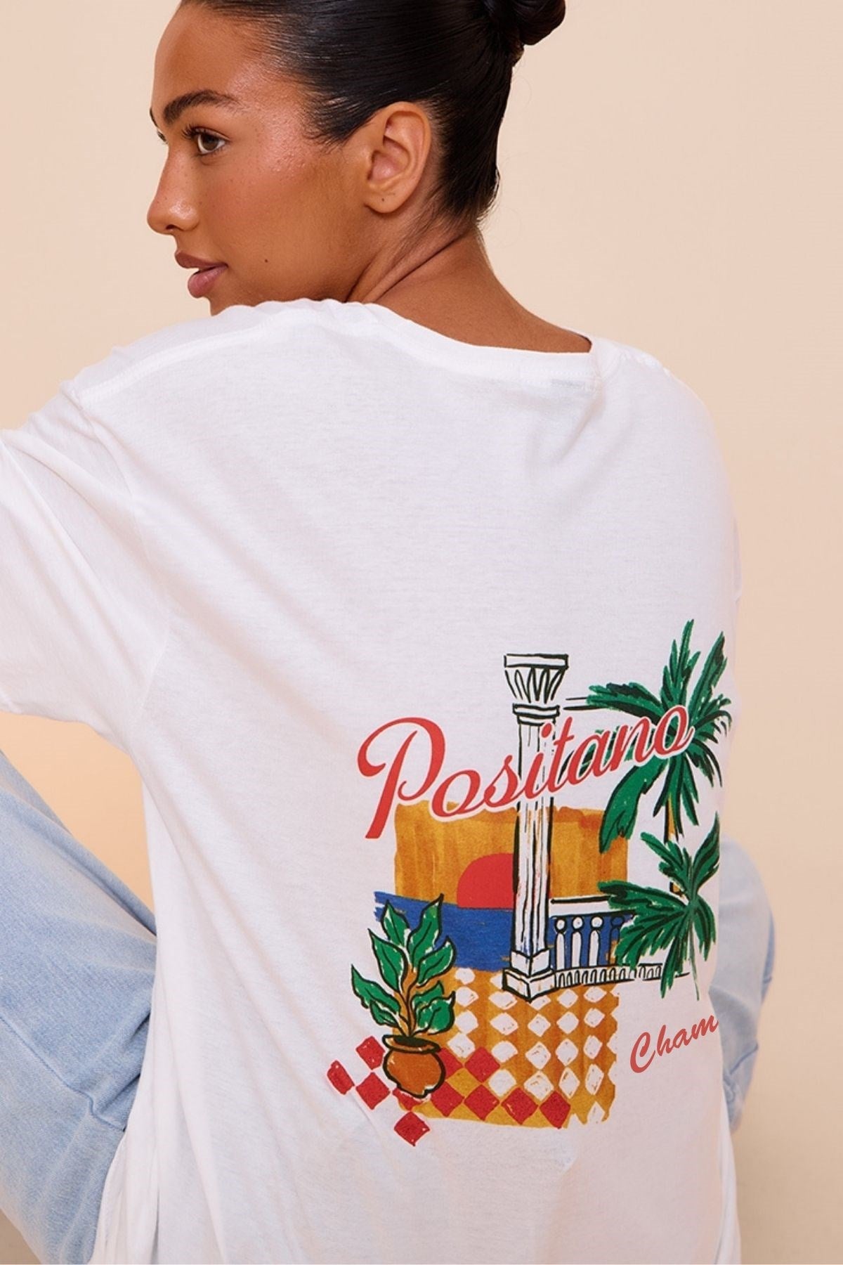 Beyaz Oversize Kadın Tişört – Positano Yaz Baskılı Pamuk Kumaş Yazlık Rahat Giyim