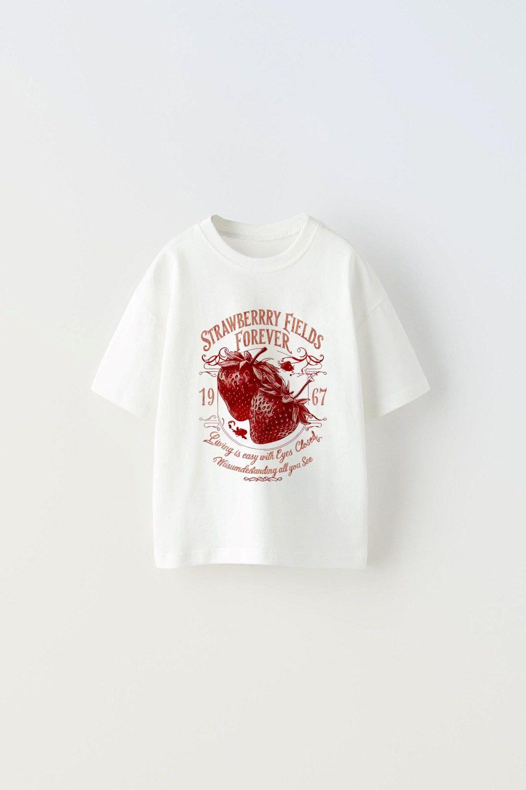Çocuk Beyaz Tişört Strawberry Fields Baskılı %100 Pamuk Rahat Kalıp Kısa Kollu Model