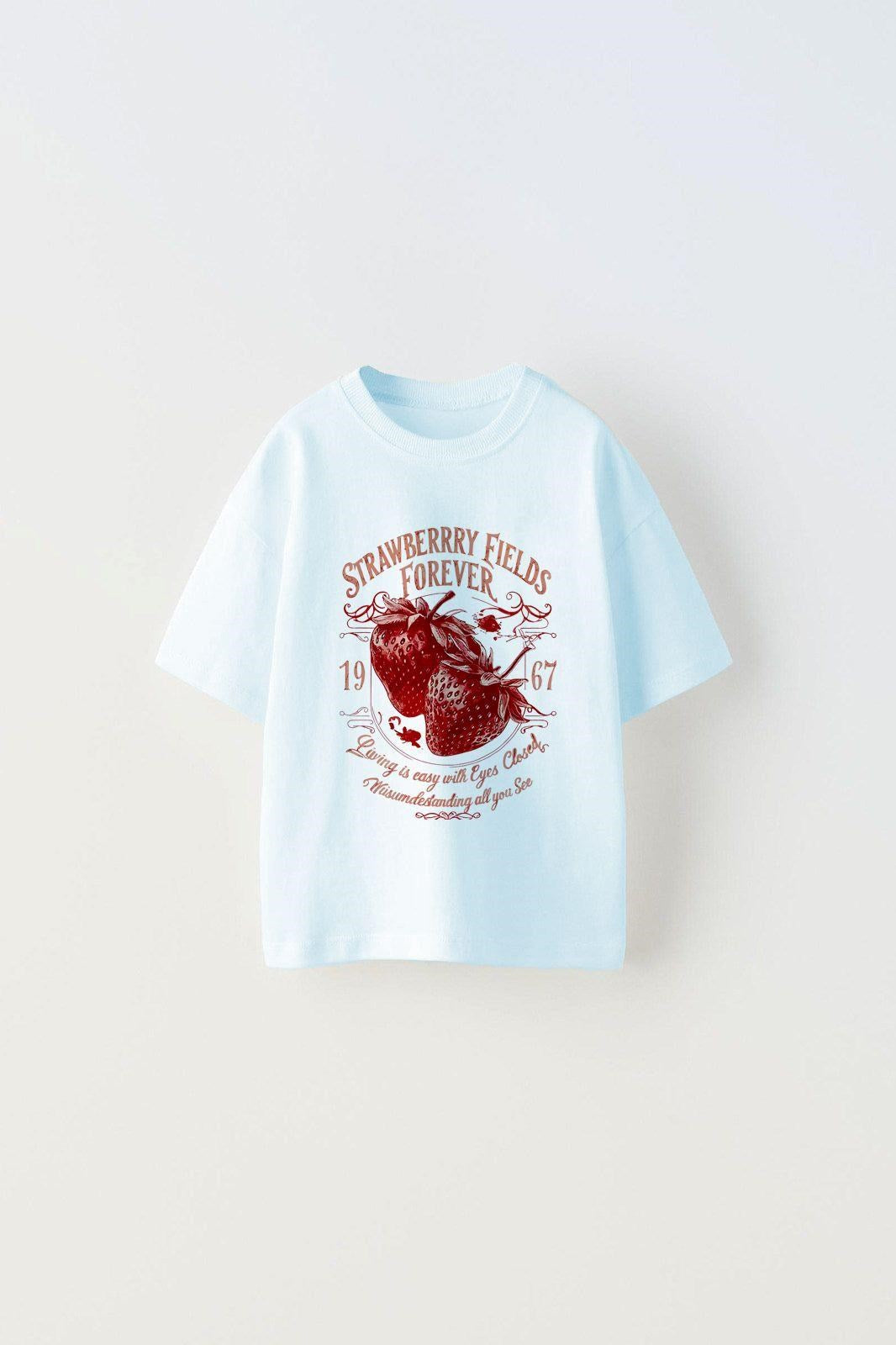 👕 Detay: Strawberry Fields Forever baskı, kısa kol, rahat kalıp, yuvarlak yaka