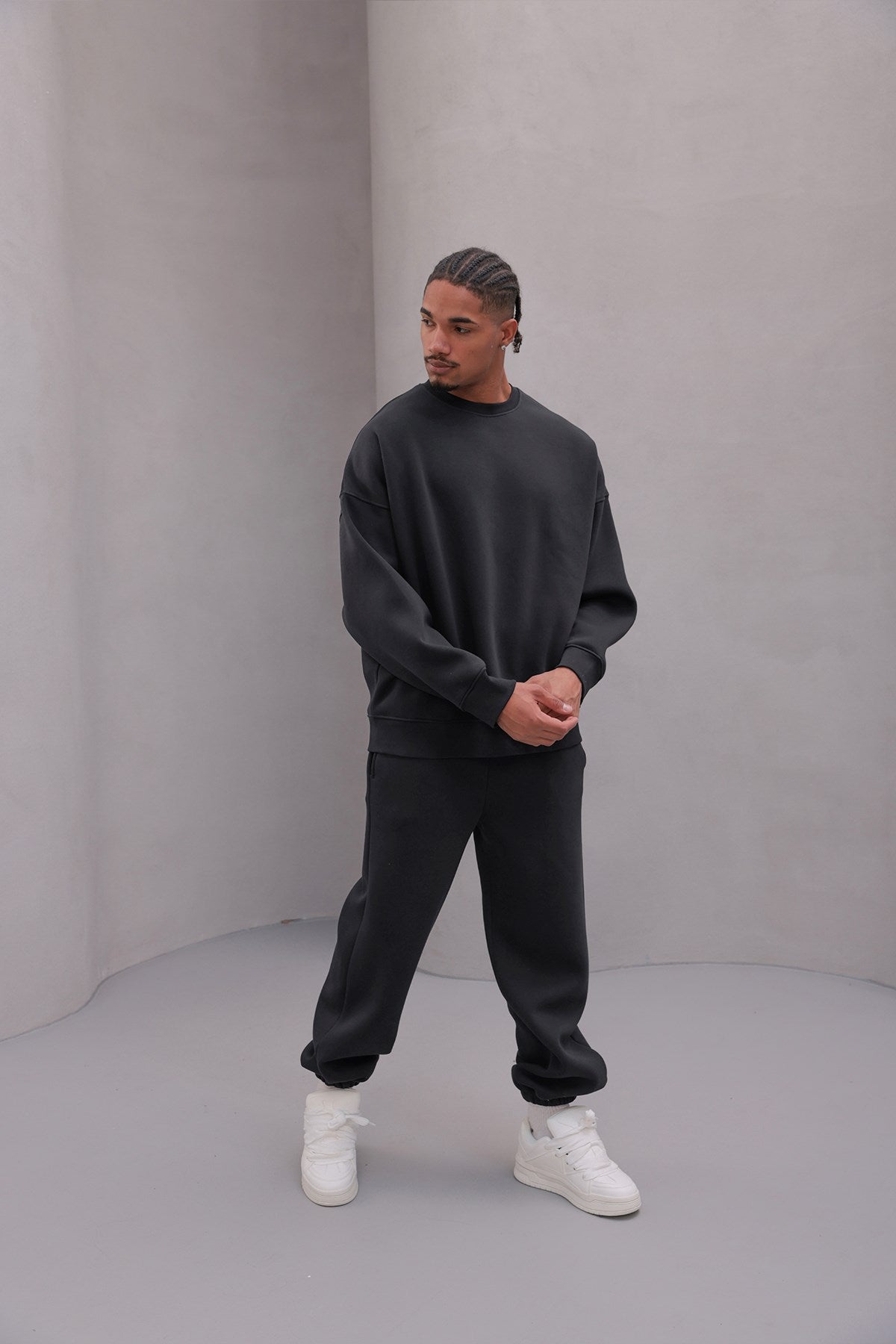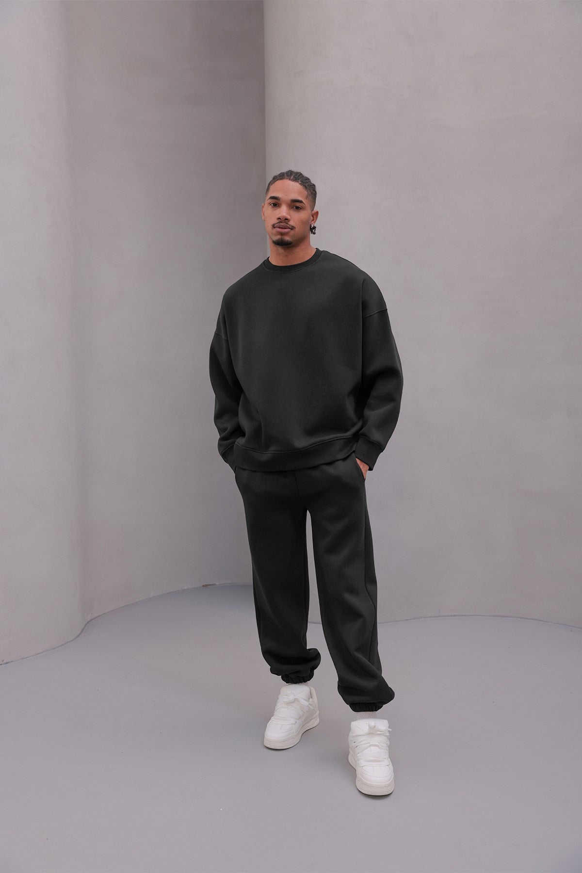 Erkek Oversize Eşofman Takımı Basic Füme – Bisiklet Yaka, Lastikli Paça, 3 İplik Şardonlu