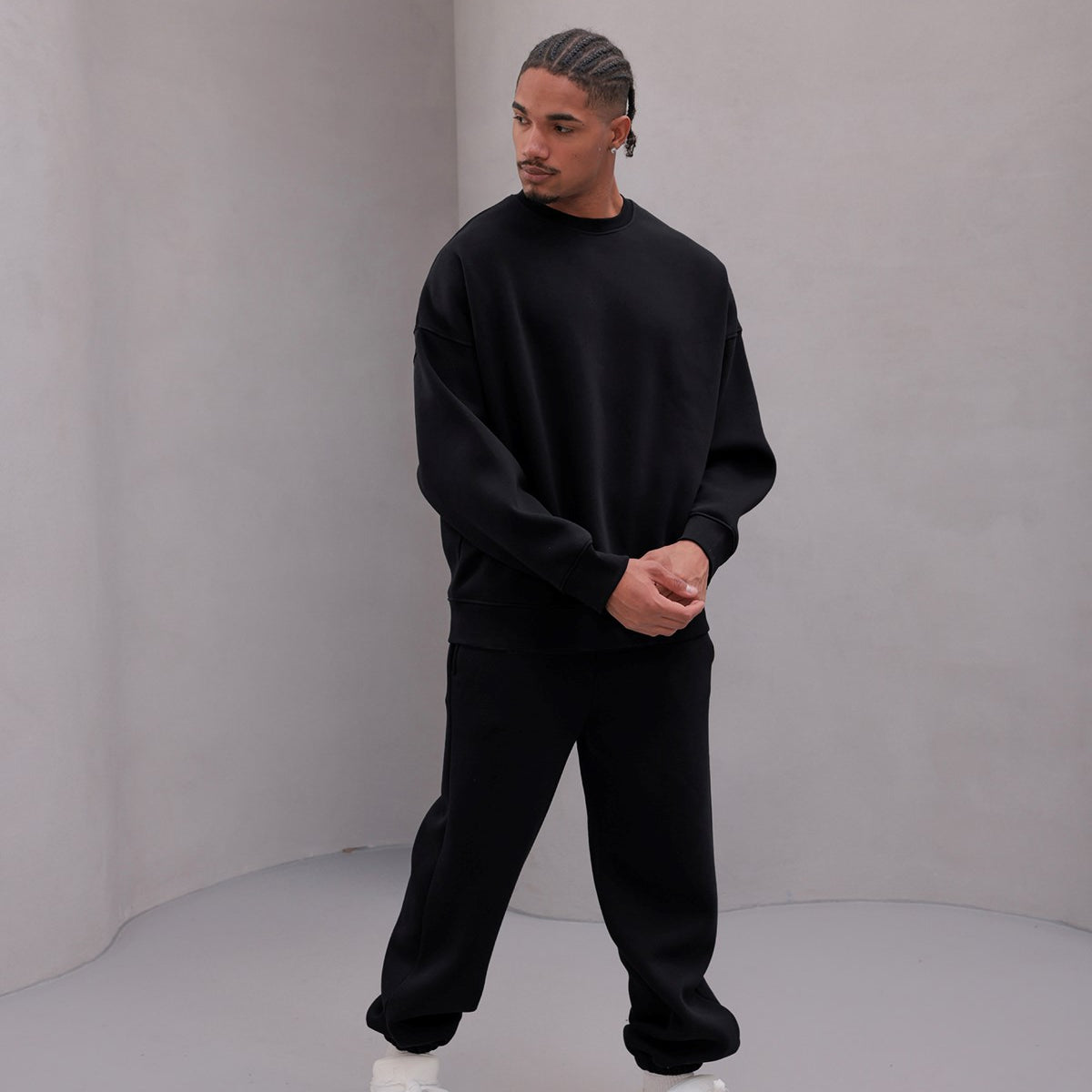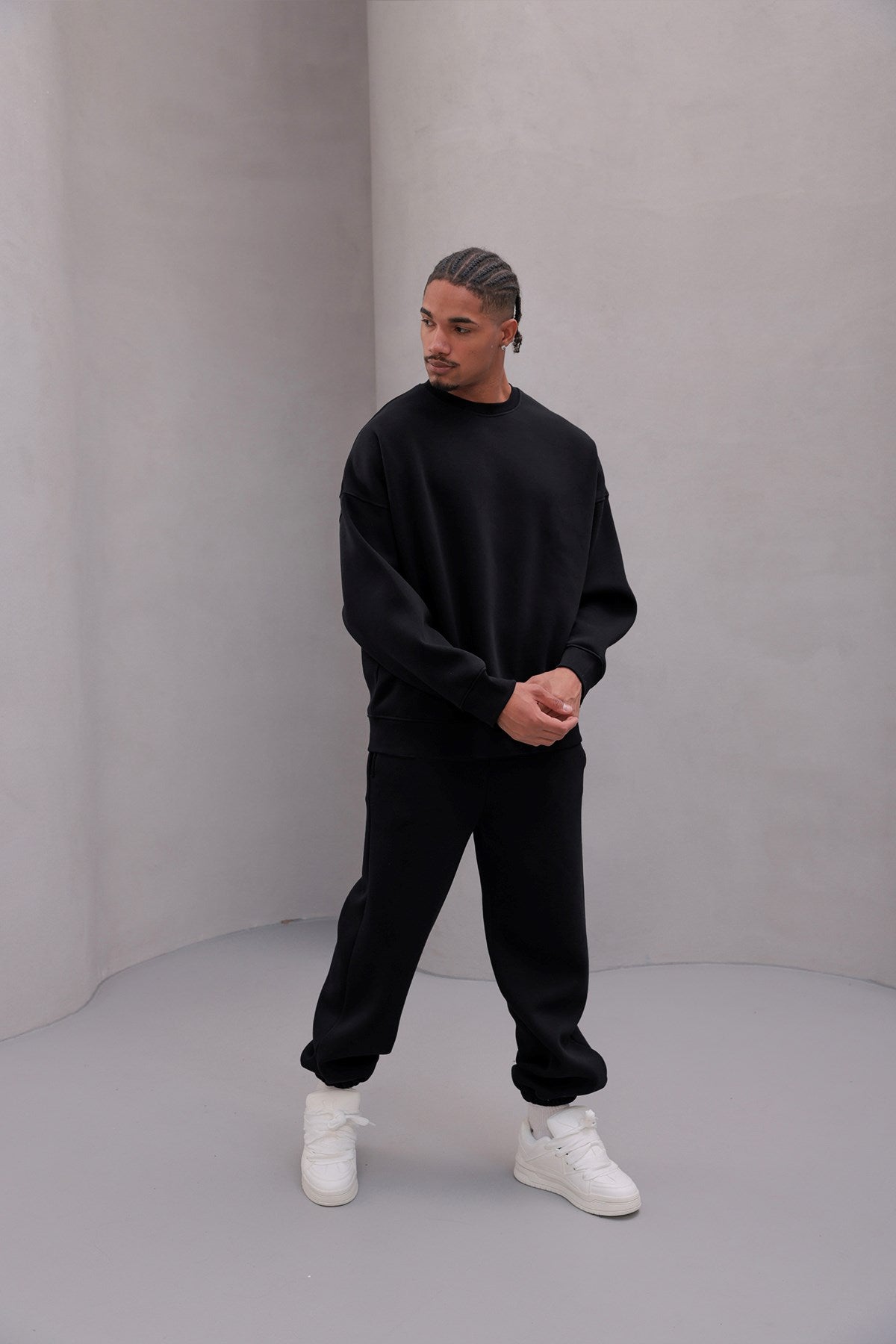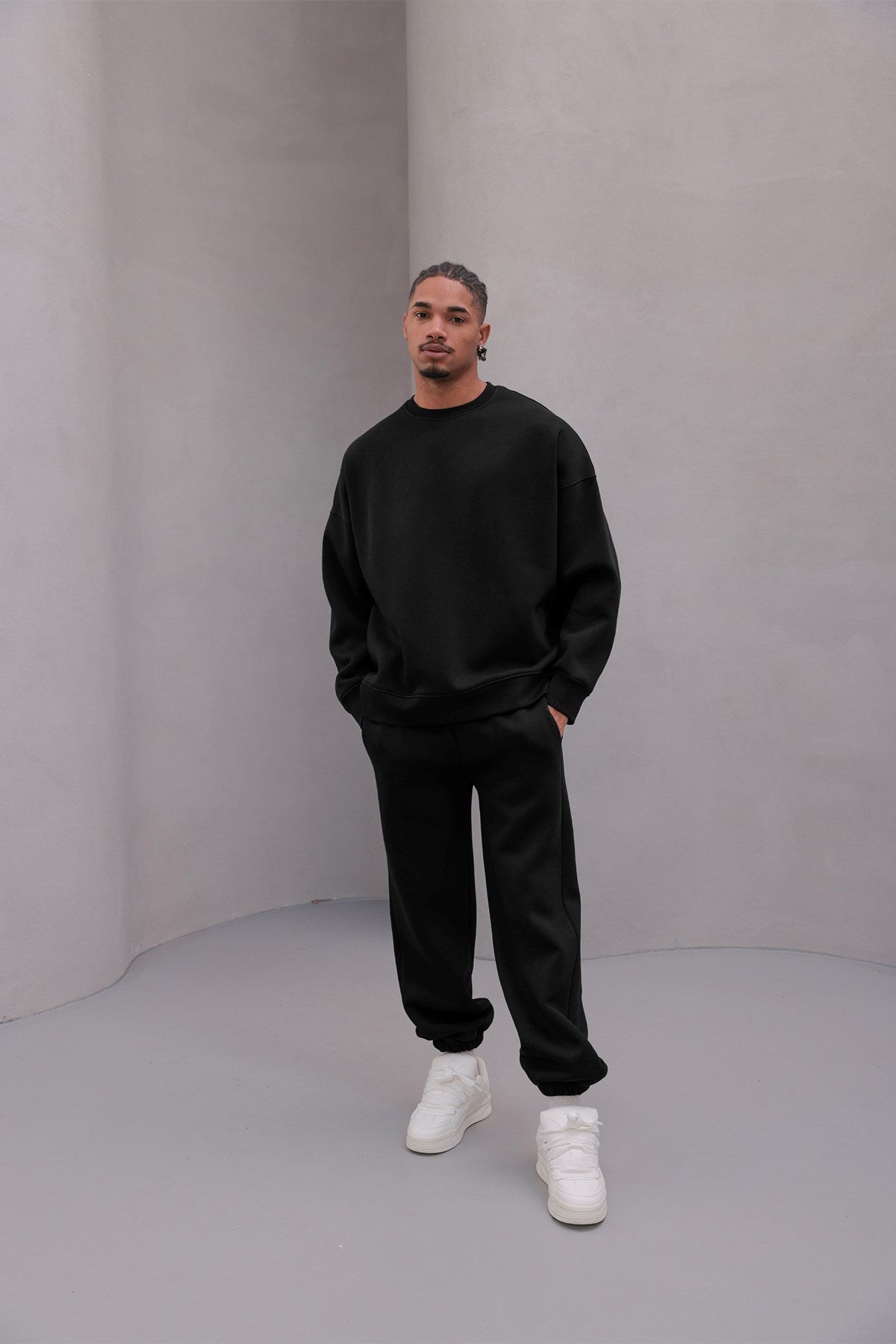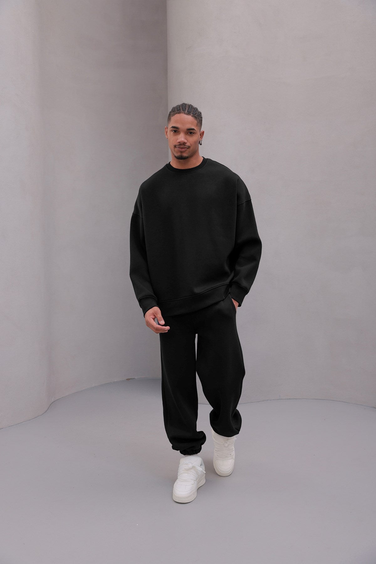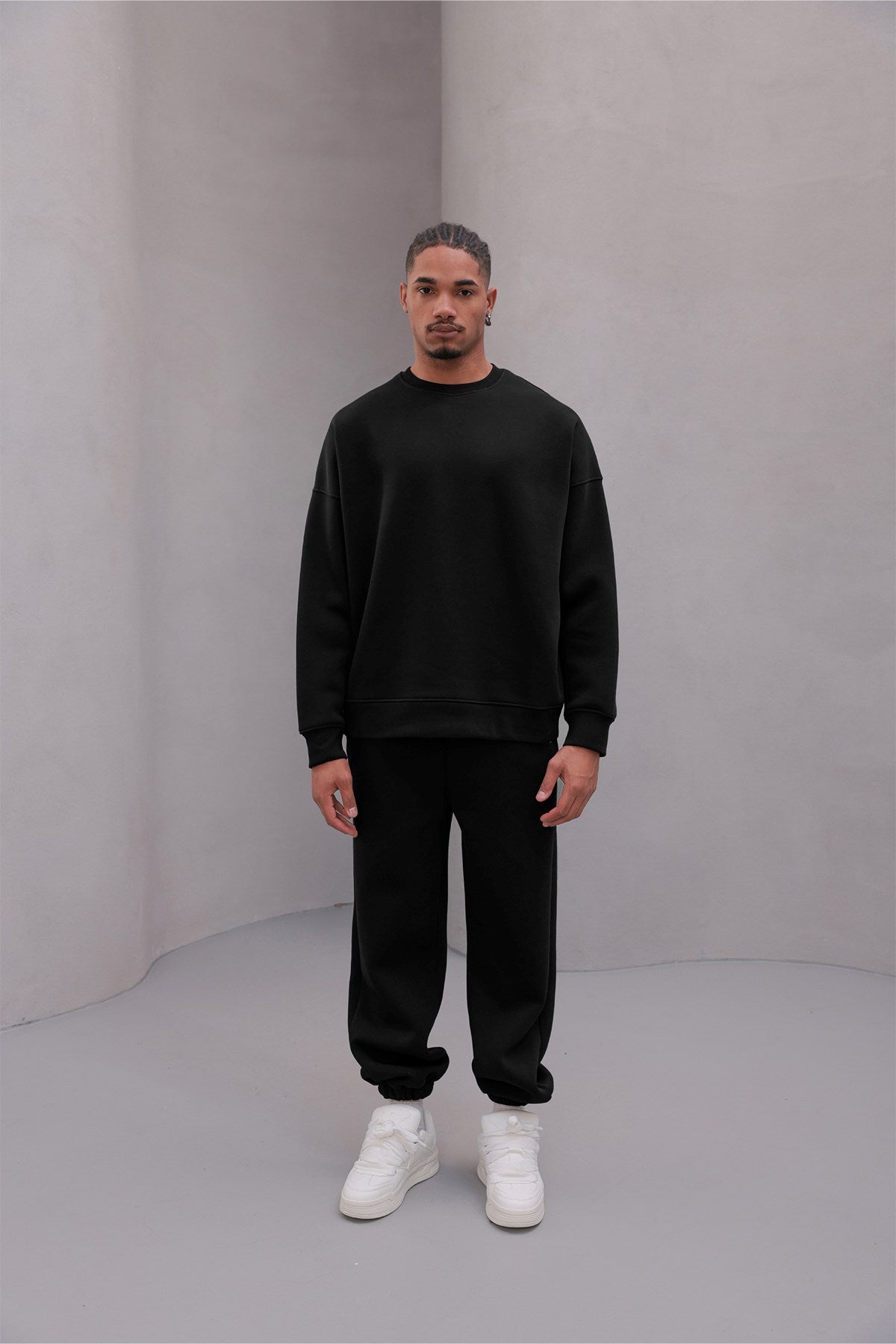 Erkek Oversize Eşofman Takımı Basic Siyah – Bisiklet Yaka, Lastikli Paça, 3 İplik Şardonlu