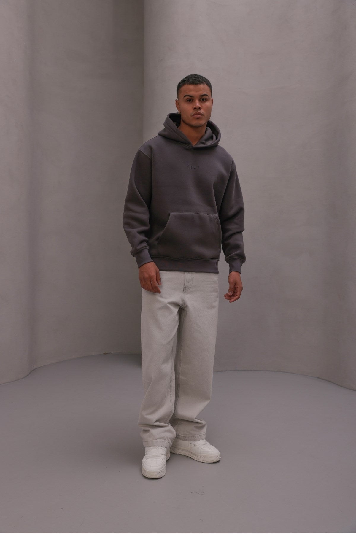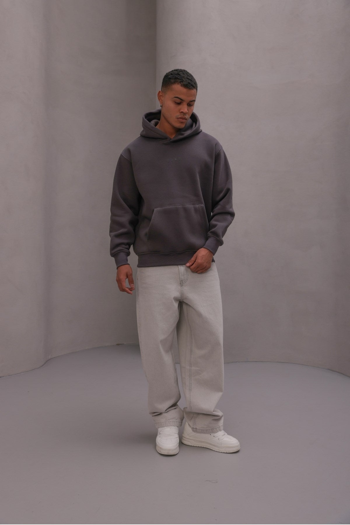 Erkek Oversize Sweatshirt Hoodie CHMP Yazlı Baskılı Füme – Kapüşonlu, 3 İplik Polar, Kanguru Cepli