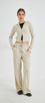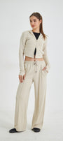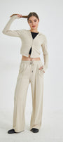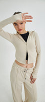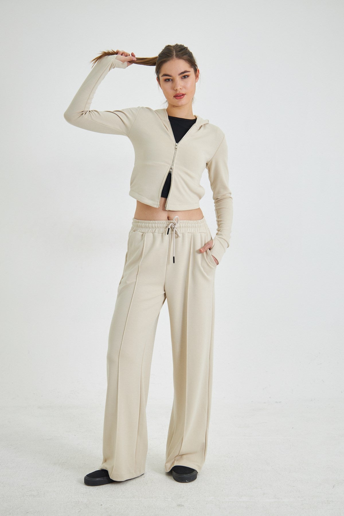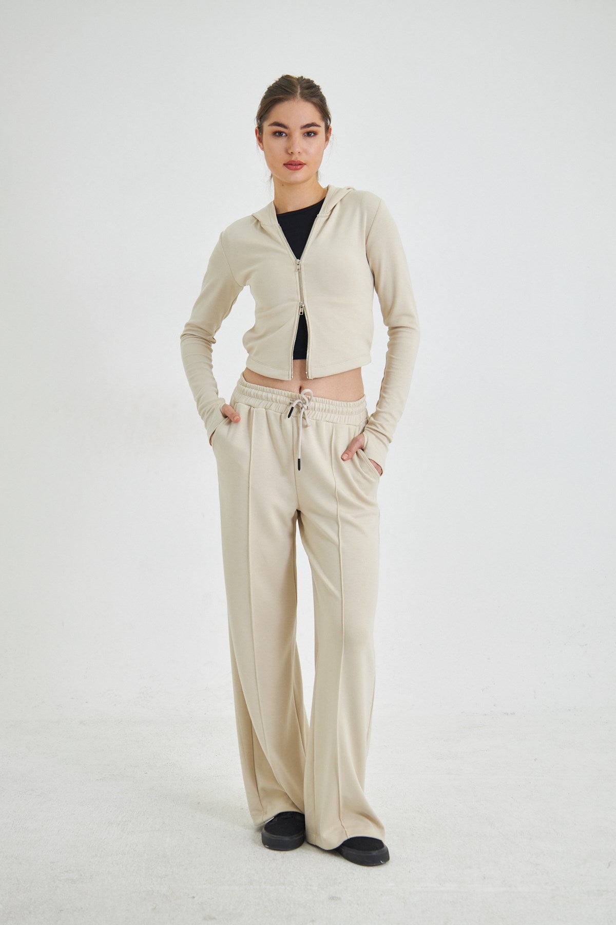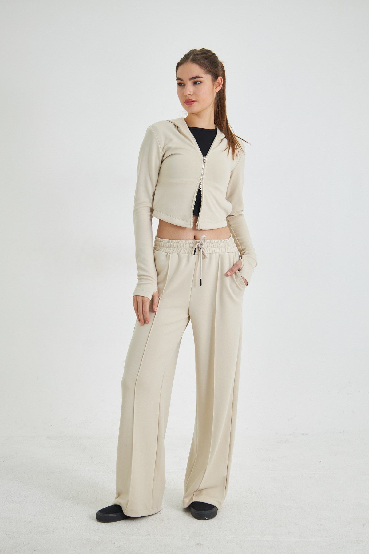 Kadın Fermuarlı Kapüşonlu Sweatshirt ve Geniş Paça Özel Dikim Pantolon Modal Kumaş Eşofman Takımı - BEJ / XS