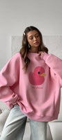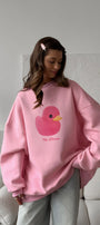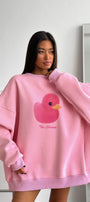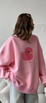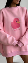 Kadın Beyaz Bisiklet Yaka Sweatshirt Elbise – Pembe Ördek Baskılı 3 İplik Şardonlu Oversize - 2XL / PEMBE