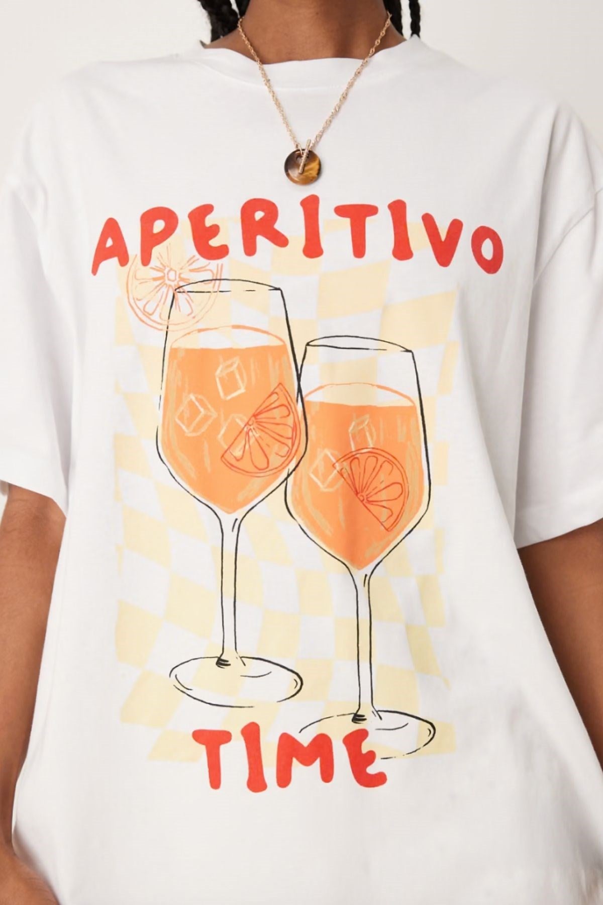 Kadın Beyaz Oversize Aperitivo Time Baskılı Yazlık Günlük Tişört