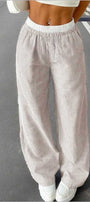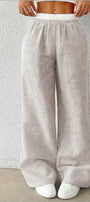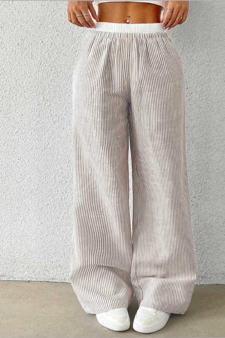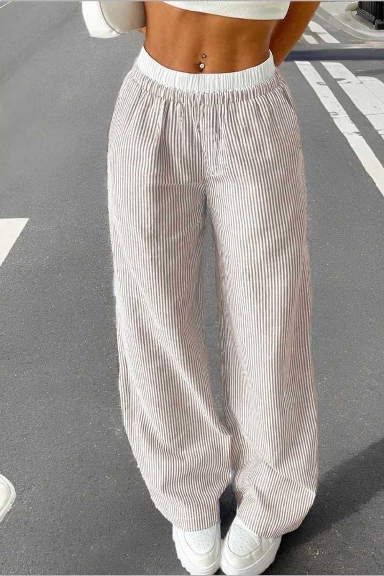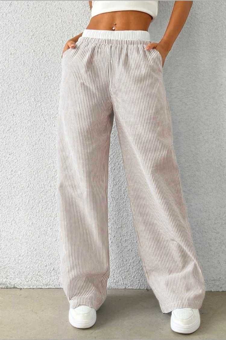 Kadın Gri Çizgili Poplin Dokuma Pantolon – Yüksek Bel Lastikli Bol Paça Rahat Model