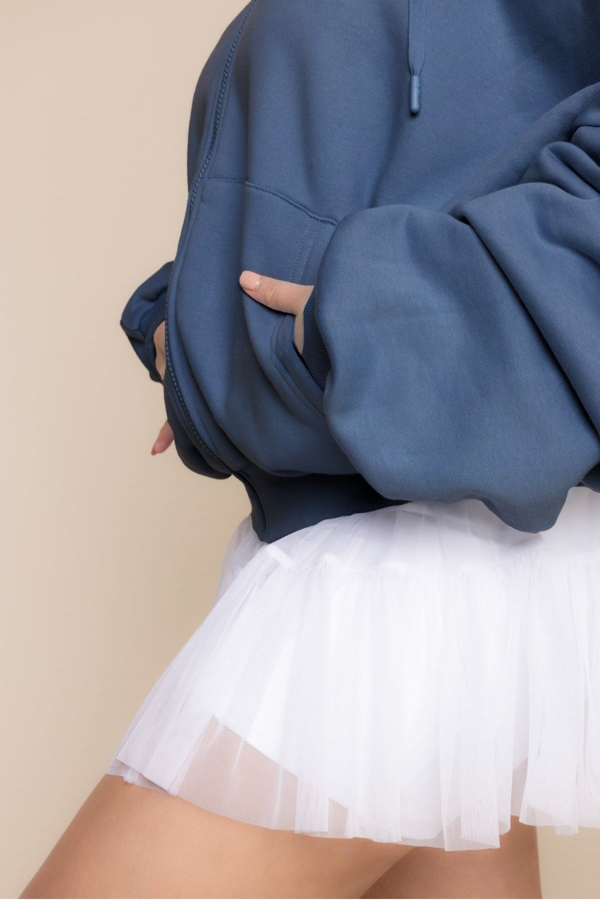 Kapüşonlu ve salaş tasarımı ile gün boyu rahatlık ve hareket özgürlüğü sunar koyu mavi rengi ile hem spor hem günlük şehir kombinlerinde kolayca uyum sağlar Tayt etek jean veya eşofman ile kombinleyerek kendi tarzını oluşturabilirsin