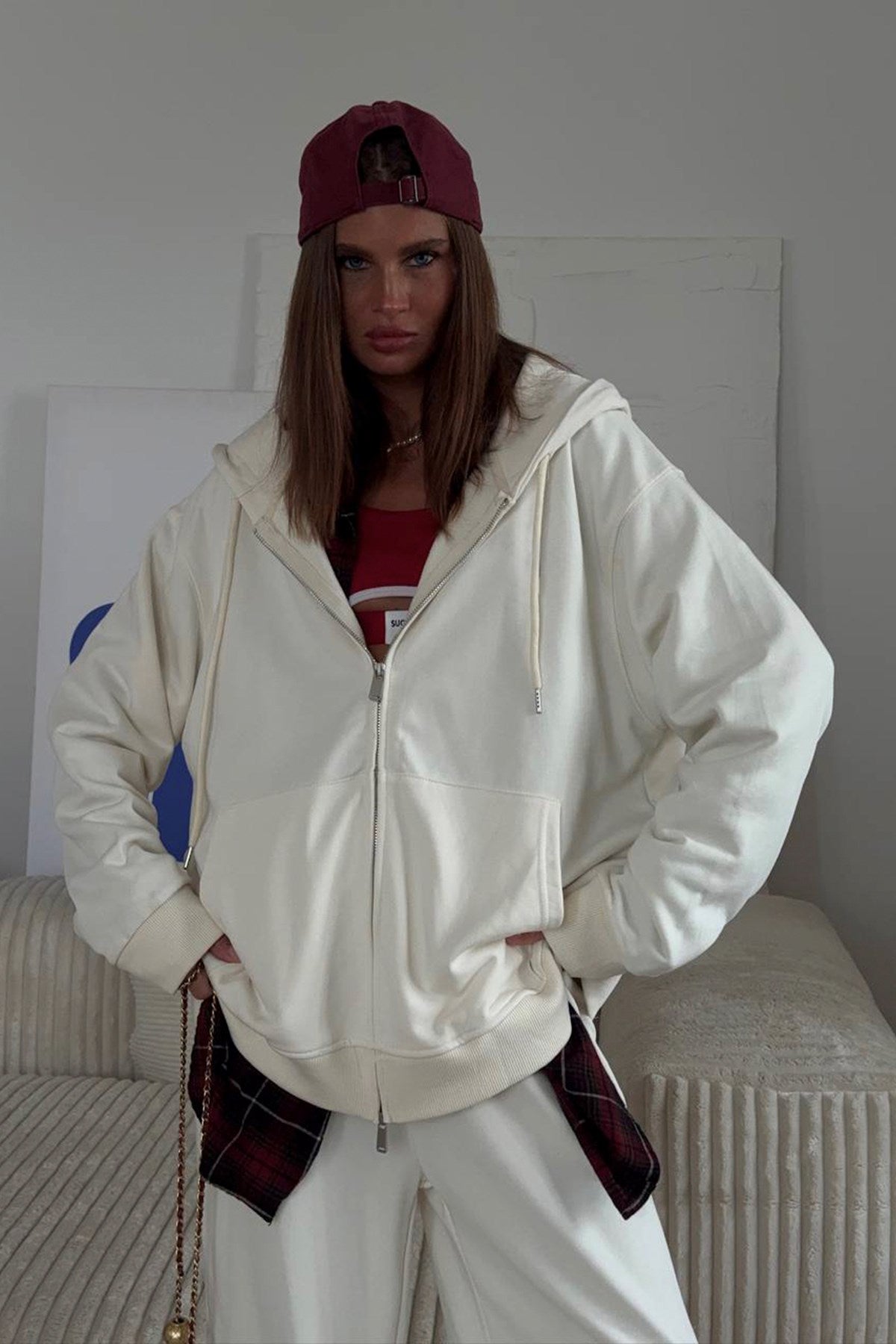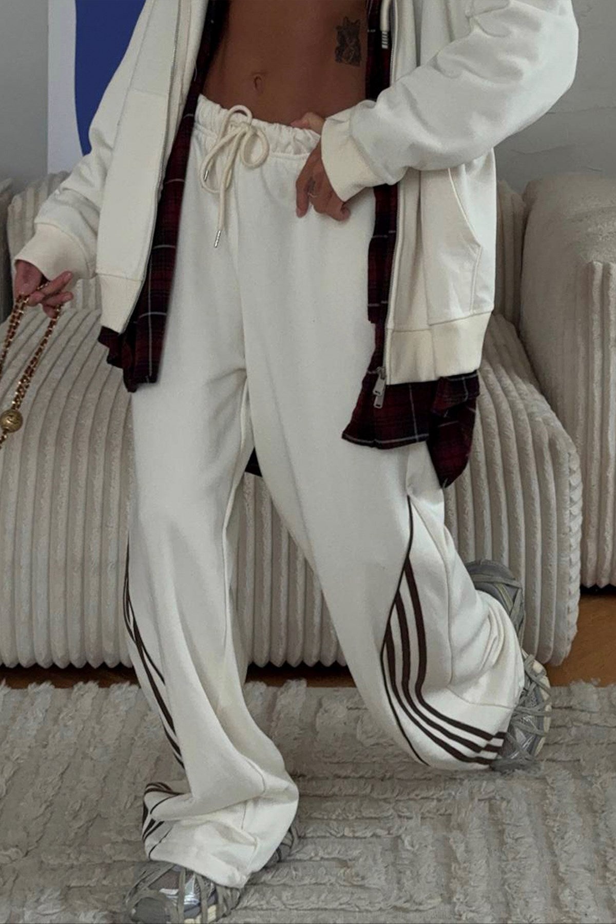 Kadın Oversize Eşofman Takımı Beyaz – Kapüşonlu Fermuarlı, Şerit Detaylı, Bağcıklı Bel, Bol paça
