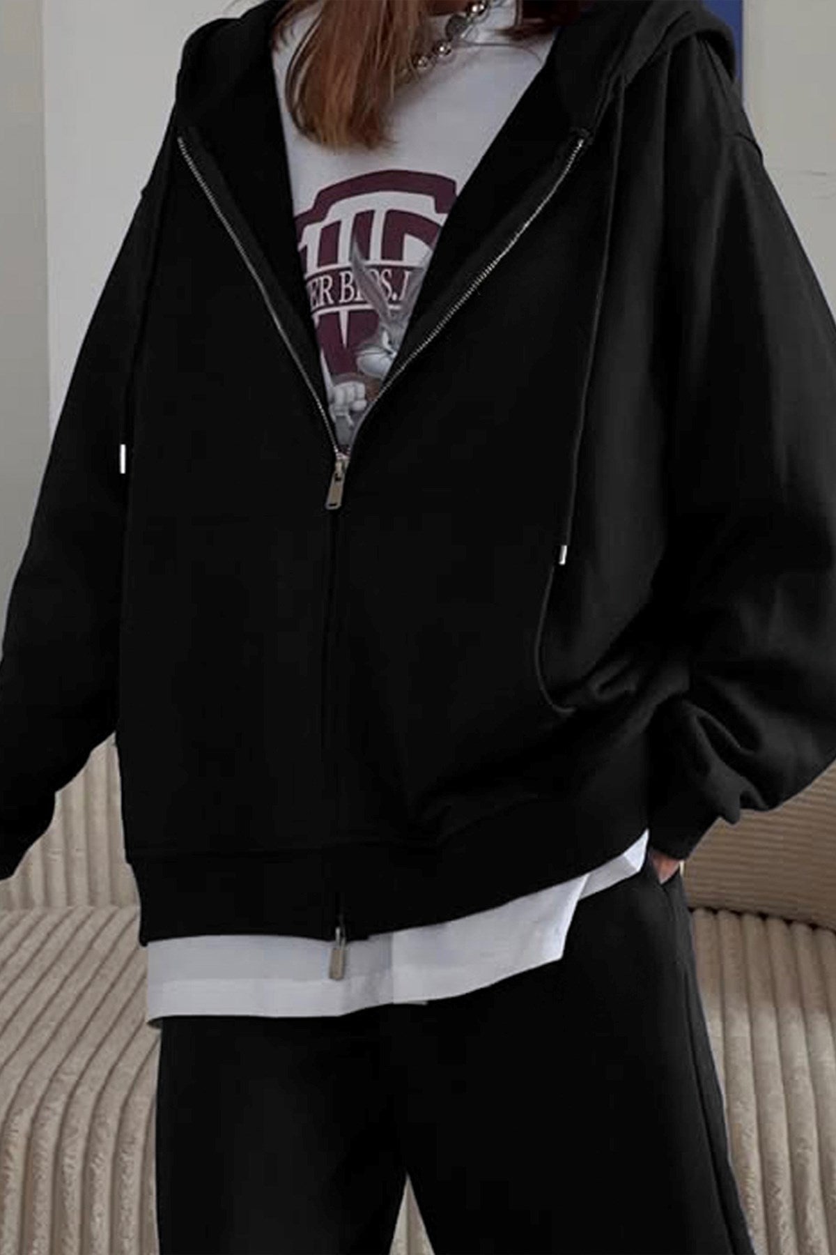 Kadın Oversize Eşofman Takımı Siyah – Kapüşonlu Fermuarlı, Şerit Detaylı, Bağcıklı Bel, Bol paça