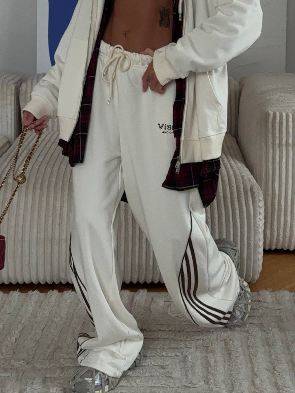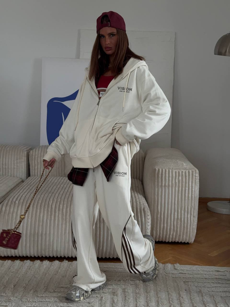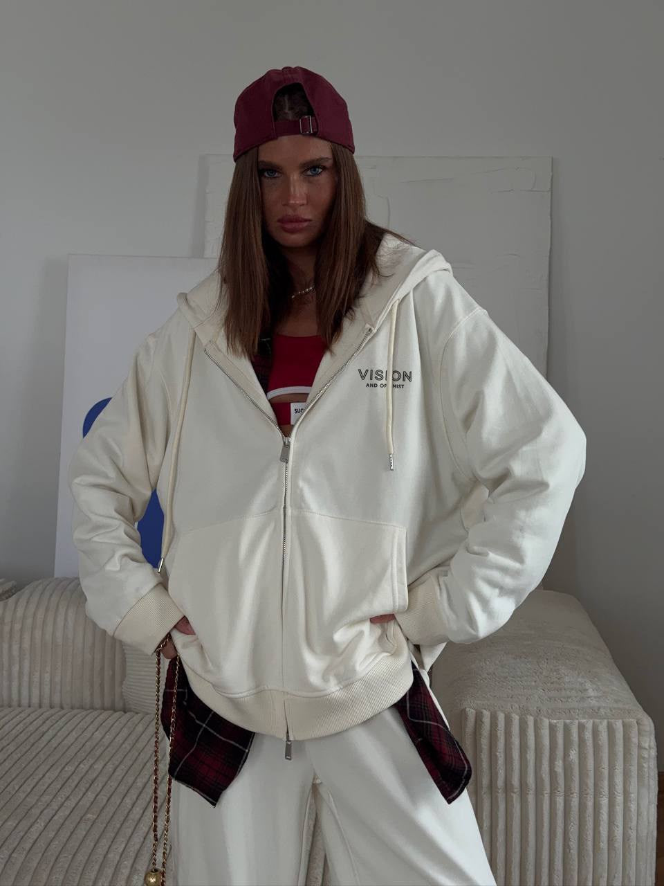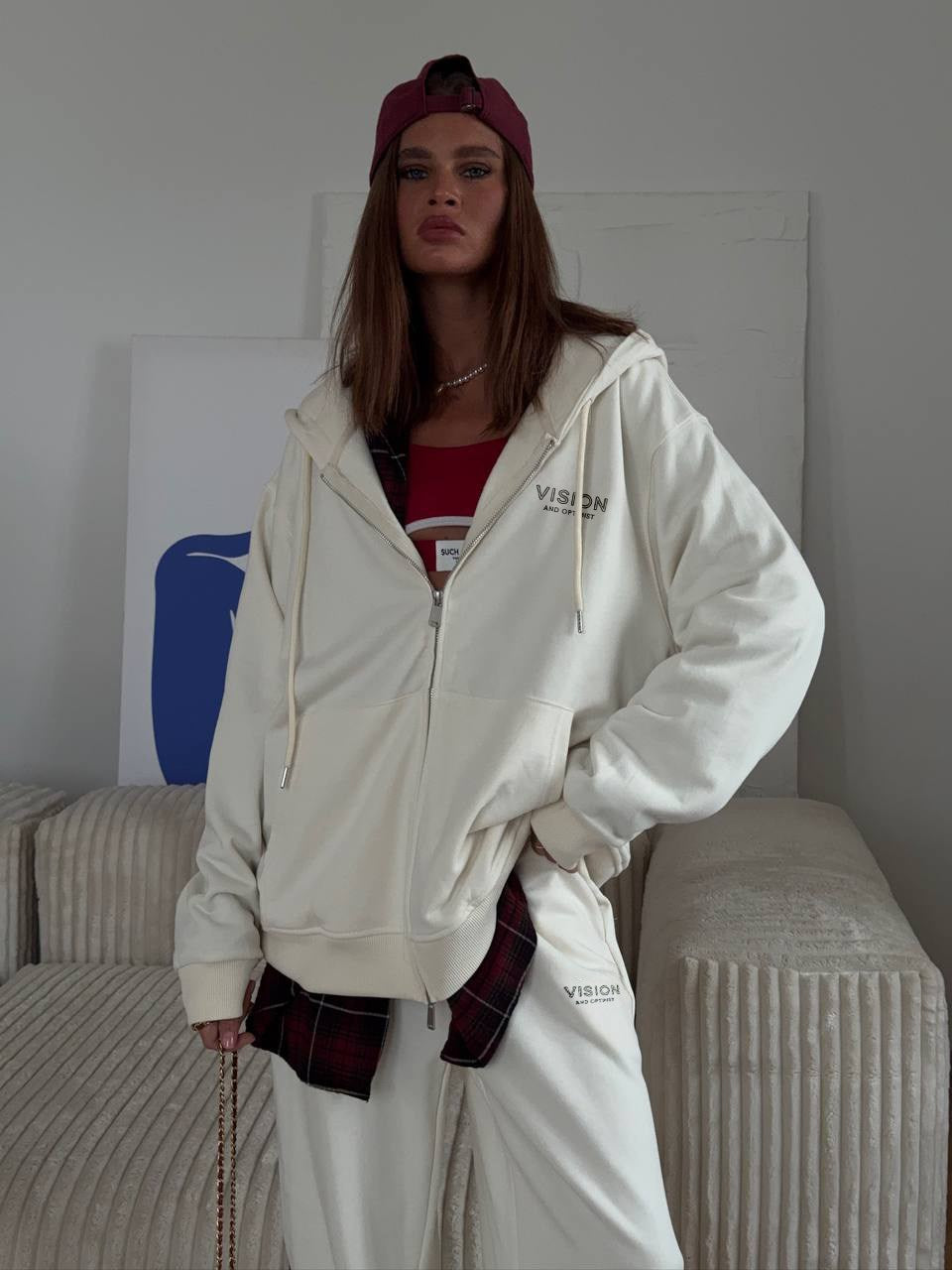 Kadın Oversize Eşofman Takımı Vision Baskılı Beyaz – Kapüşonlu Fermuarlı, Bağcıklı Bel, Boru paça