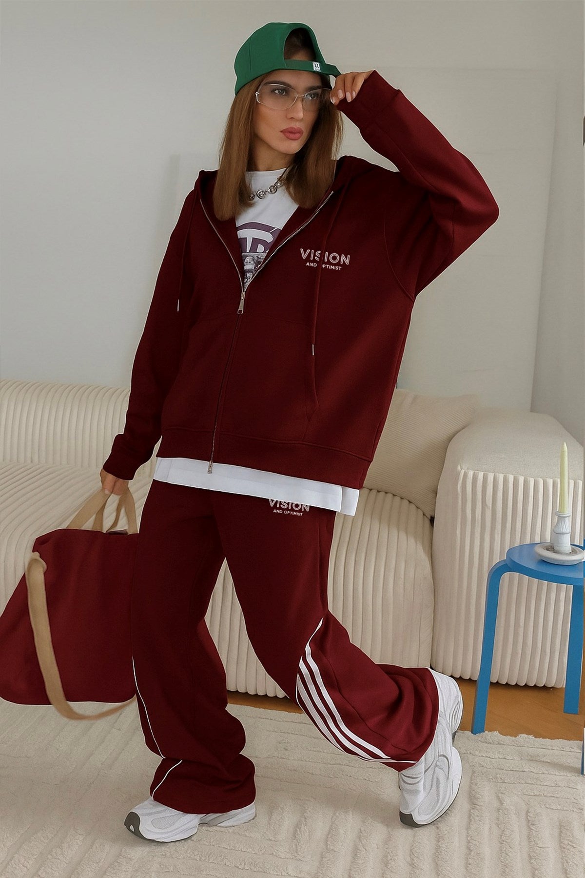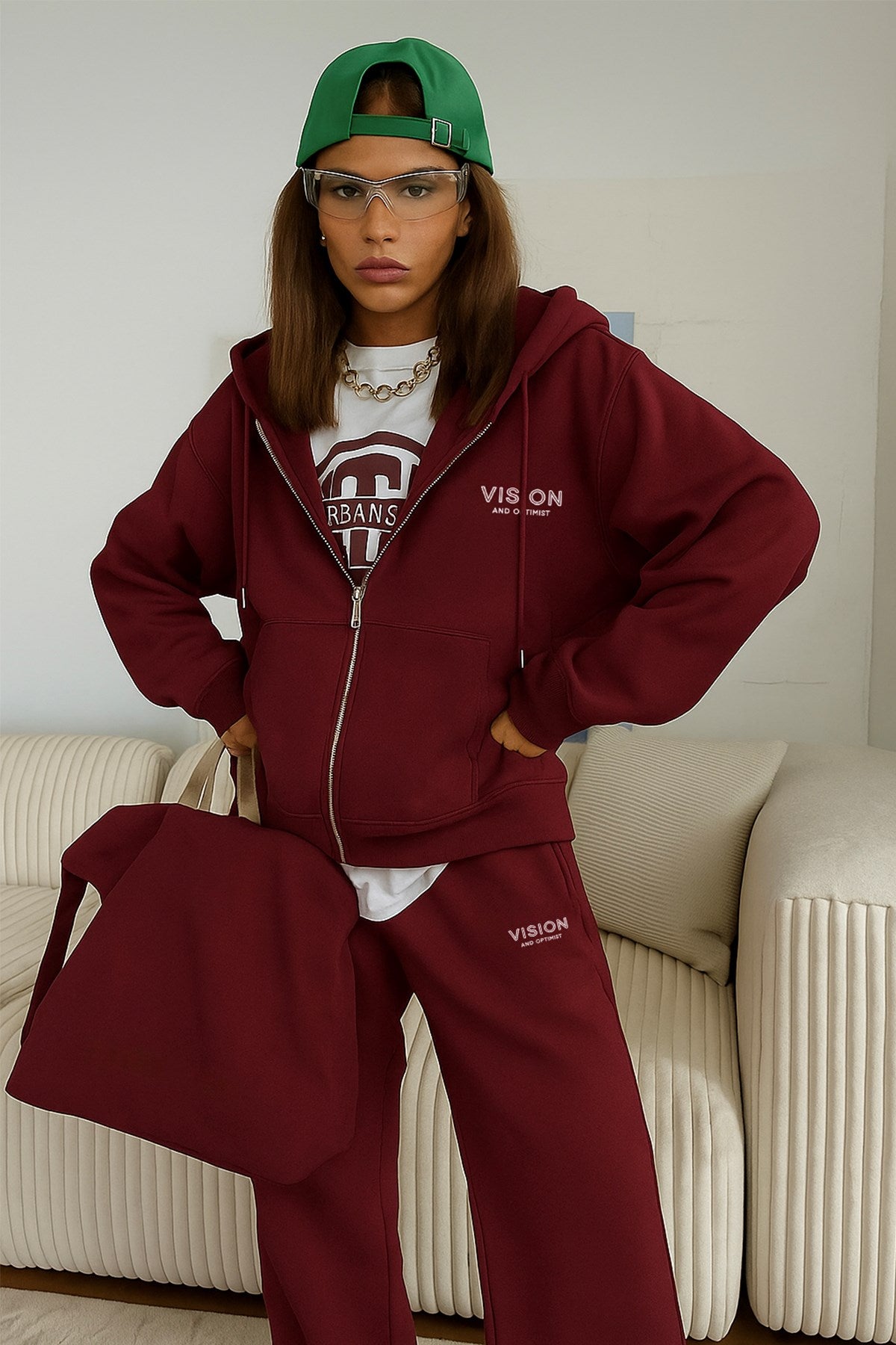 Kadın Oversize Eşofman Takımı Vision Baskılı Bordo – Kapüşonlu Fermuarlı, Bağcıklı Bel, Boru paça