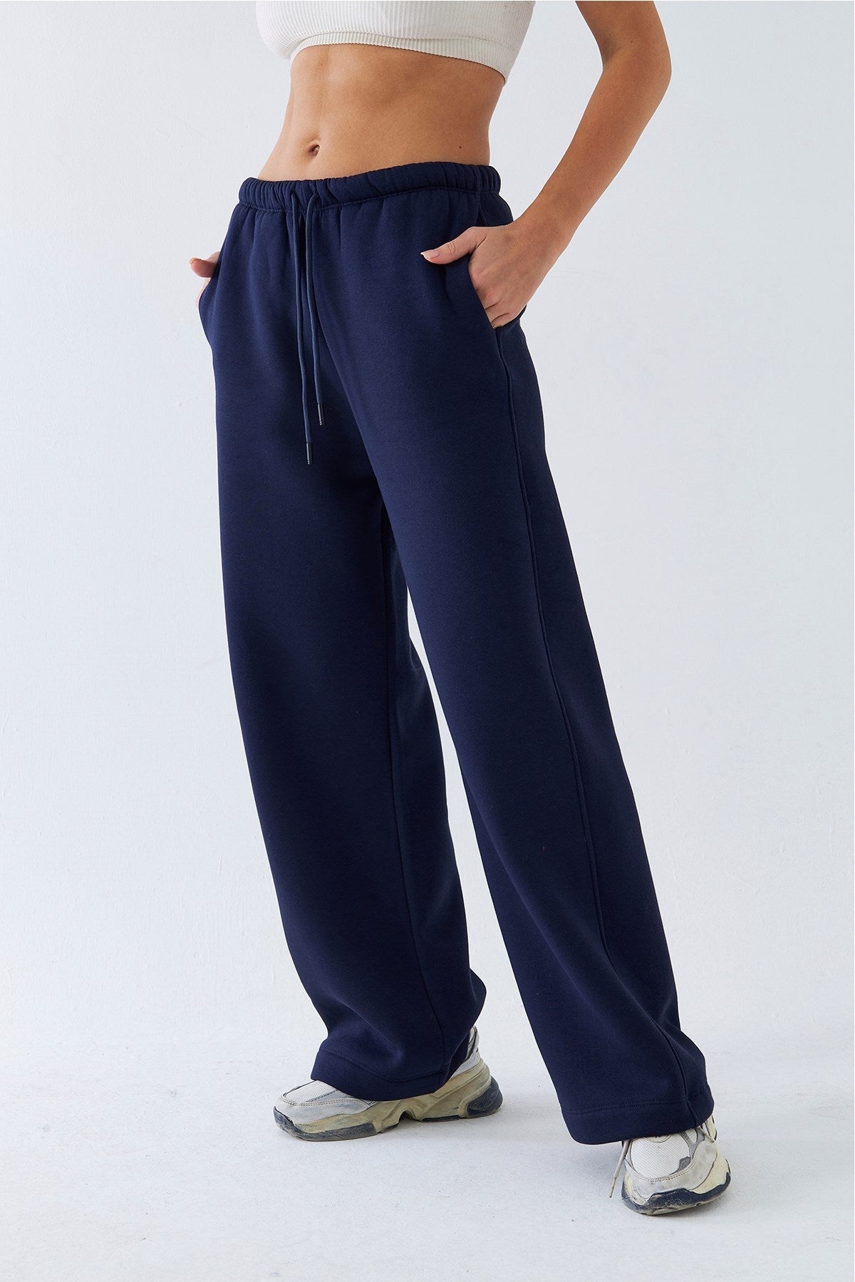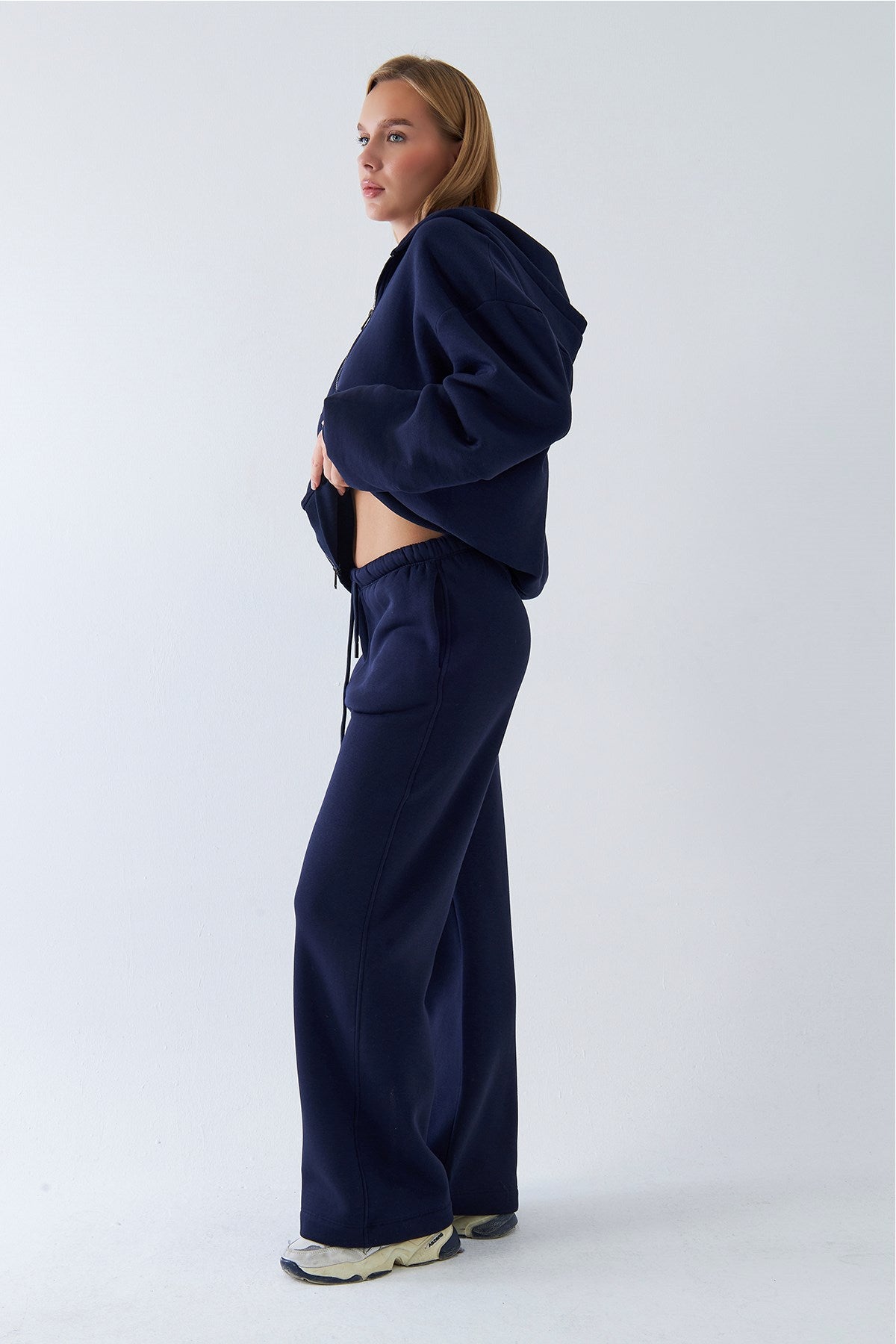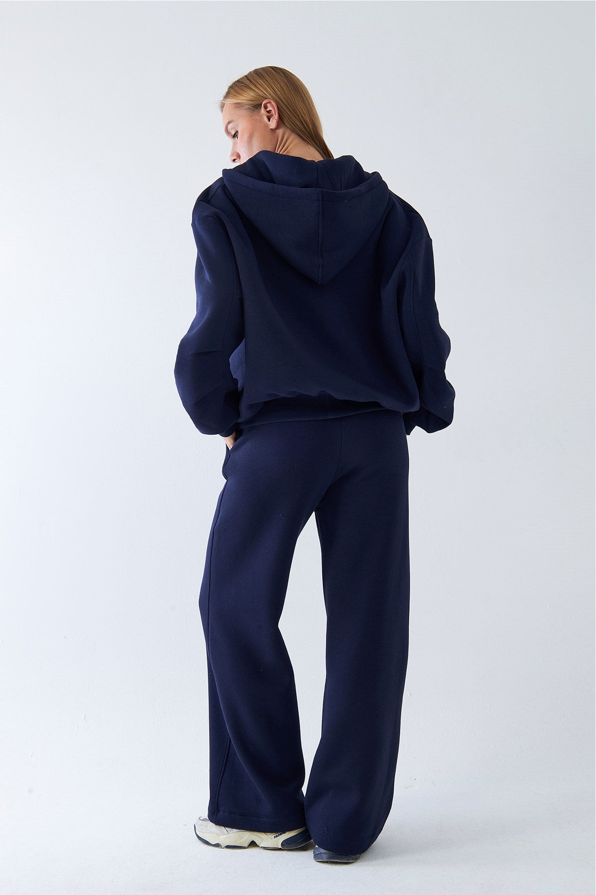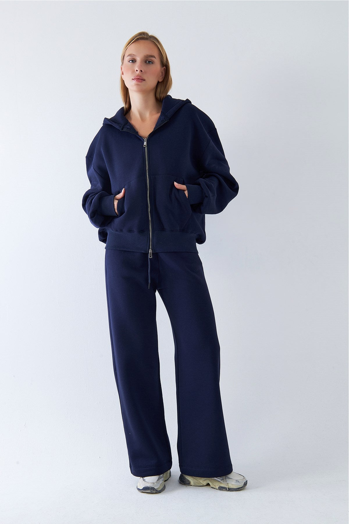 Kadın Oversize Eşofman Takımı Zip Lacivert – Fermuarlı, Kapüşonlu, Bol Paça, 3 İplik Şardonlu Polar