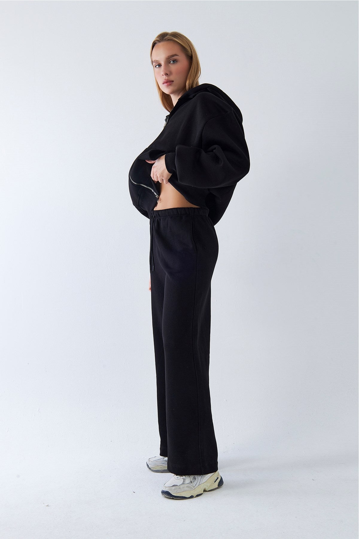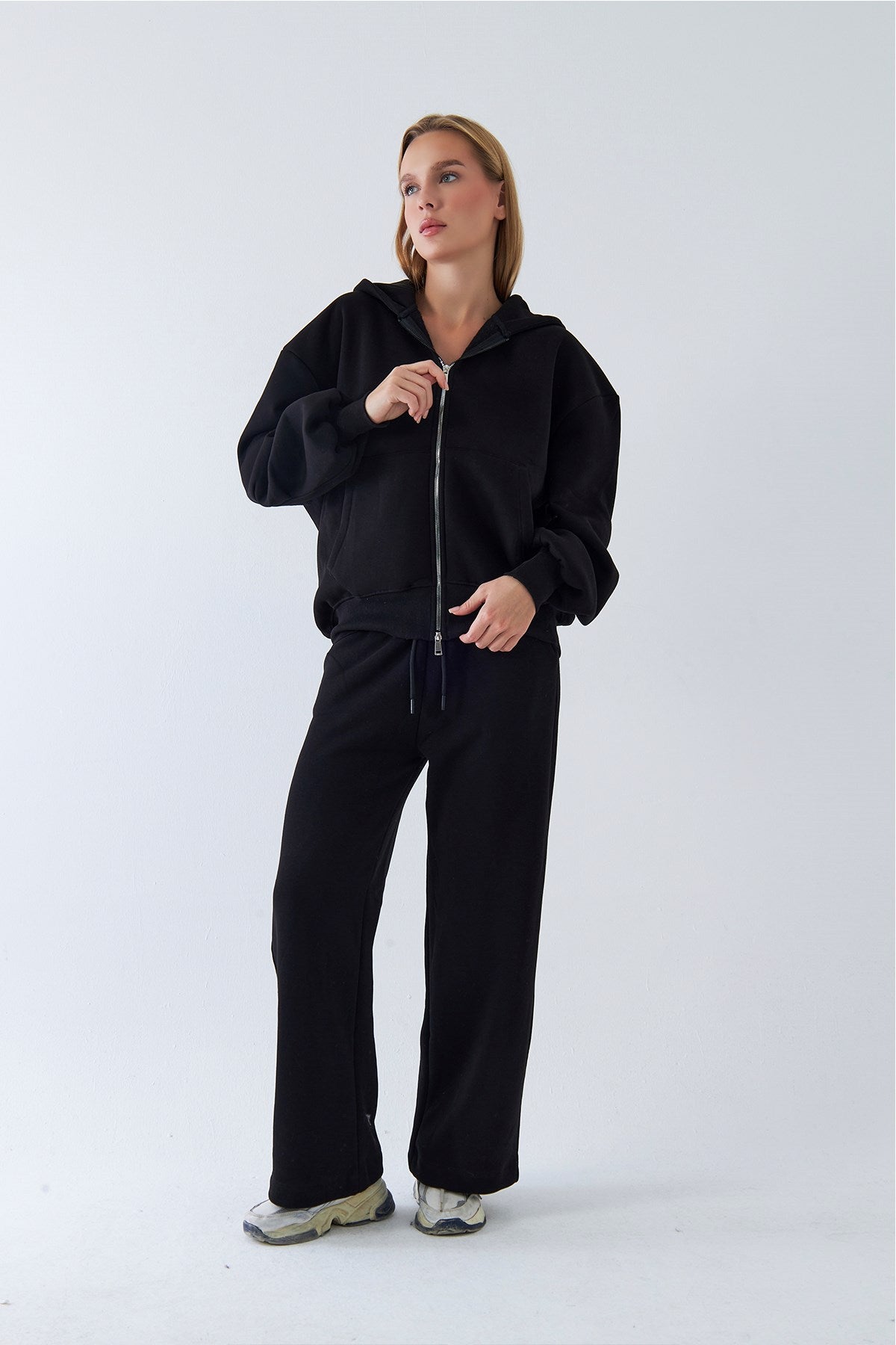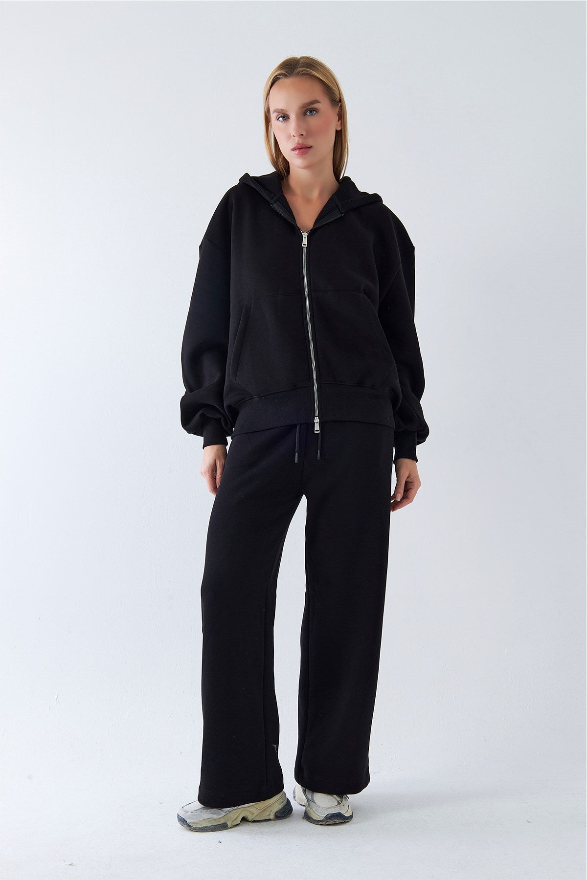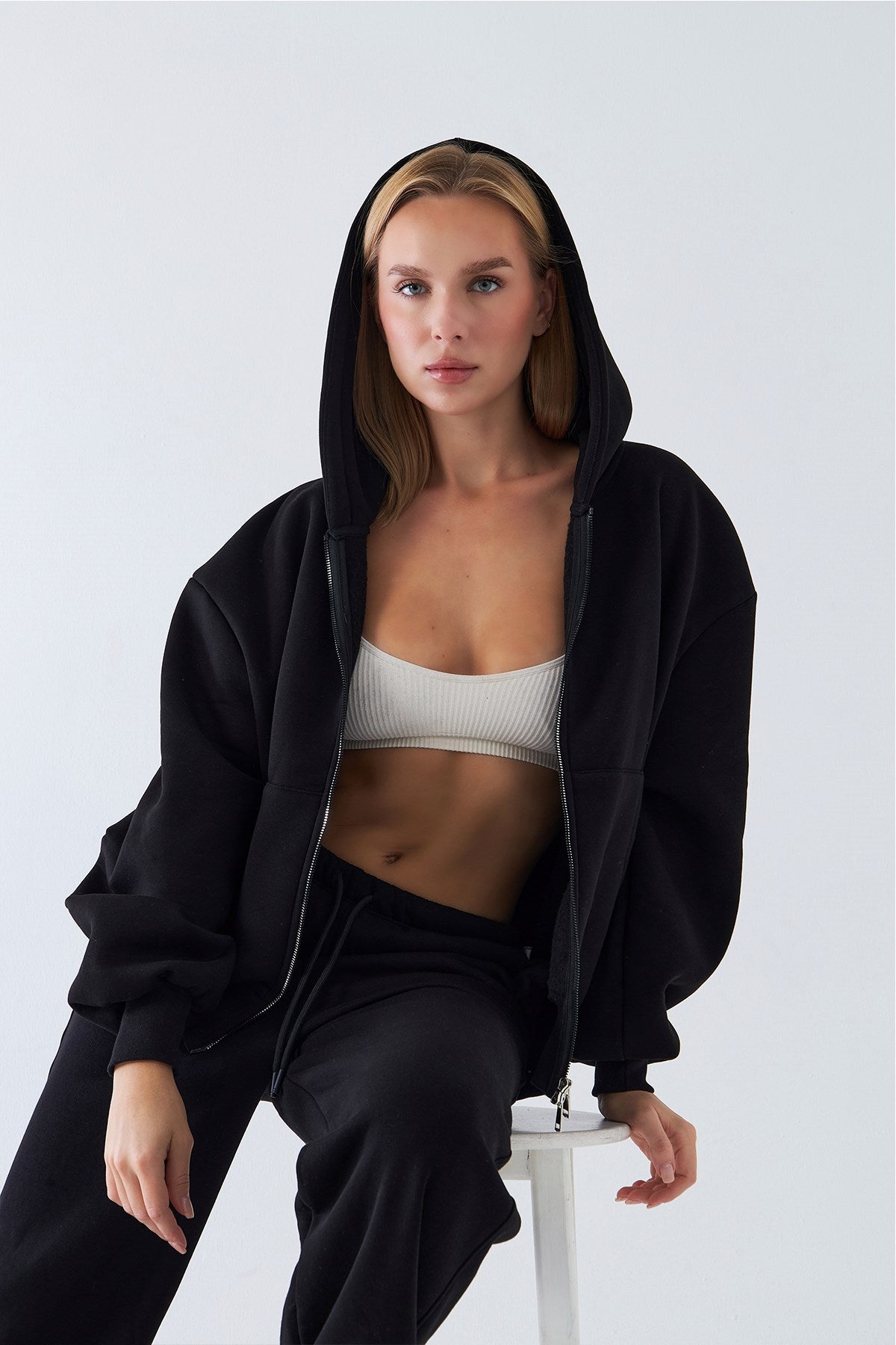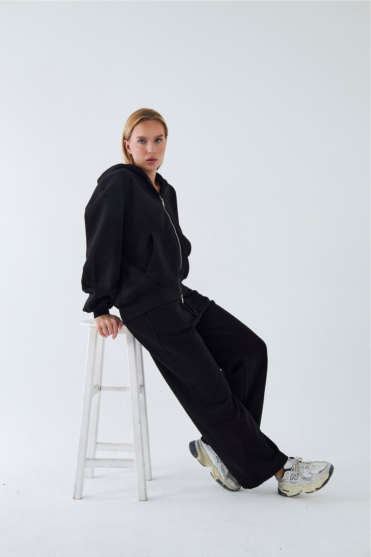 Kadın Oversize Eşofman Takımı Zip Siyah – Fermuarlı, Kapüşonlu, Bol Paça, 3 İplik Şardonlu Polar