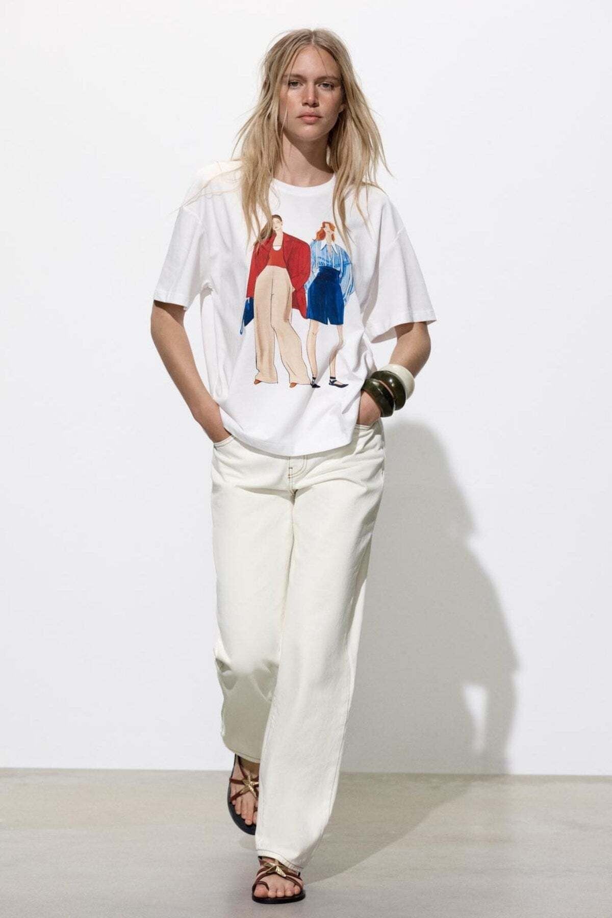 Kadın Oversize İllüstrasyon Baskılı Tişört + Bez Çanta Hediyeli Kombin – %100 Pamuk