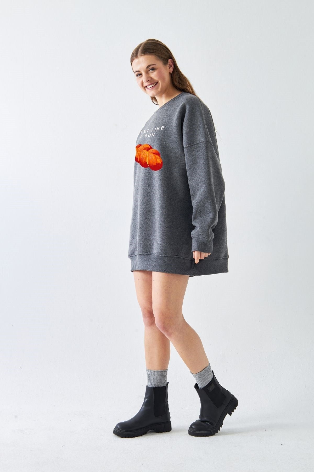 Kadın Oversize Sweat Elbise Bakery BUN Baskılı Füme Melanj – Bisiklet Yaka, 3 İplik Polar