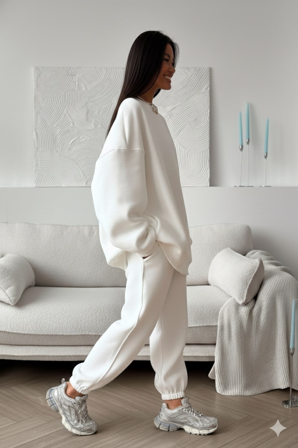 Kadın Double Oversize Eşofman Takımı Basic Beyaz– Bisiklet Yaka, Lastikli Paça, 3 İplik Polar