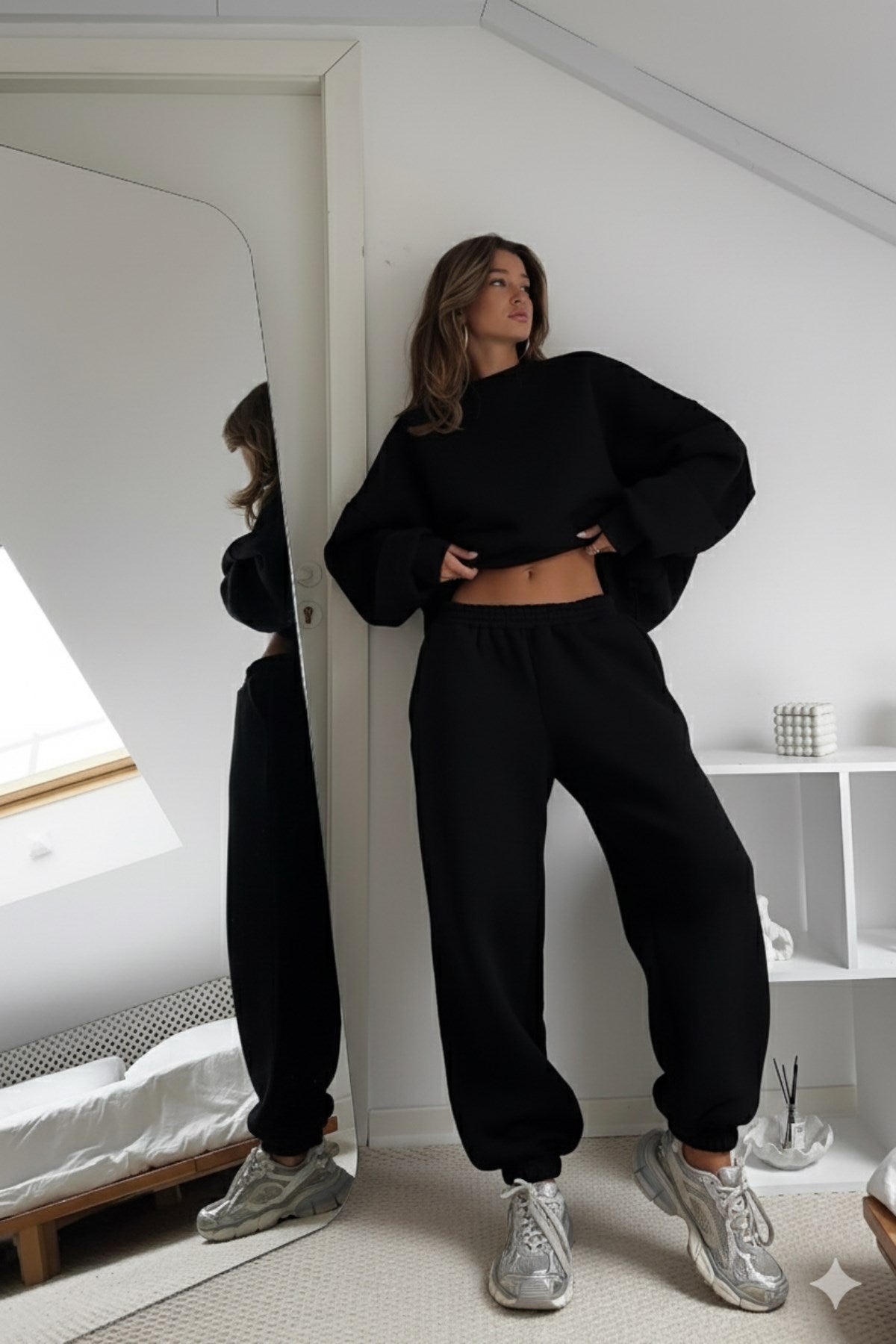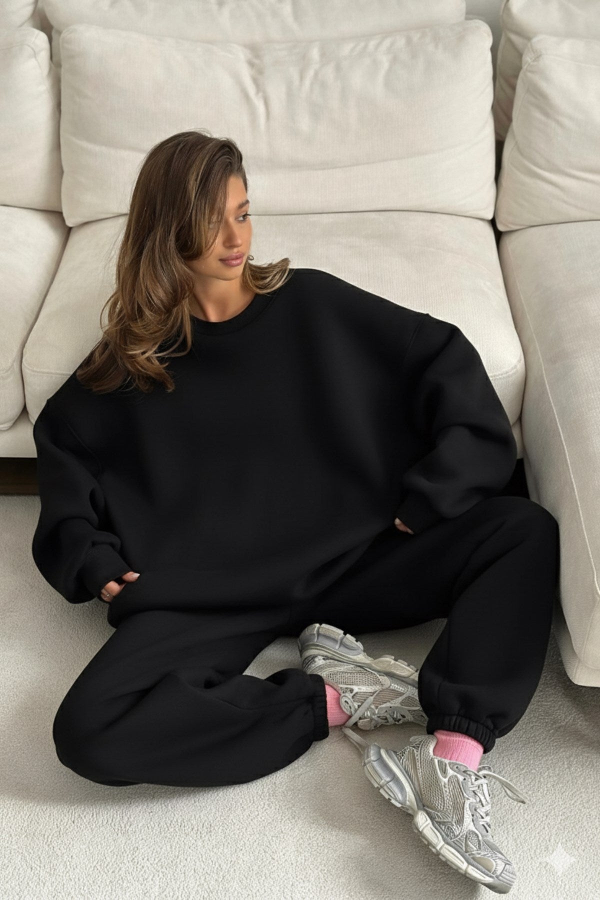 Kadın Double Oversize Eşofman Takımı Basic Siyah – Bisiklet Yaka, Lastikli Paça, 3 İplik Polar