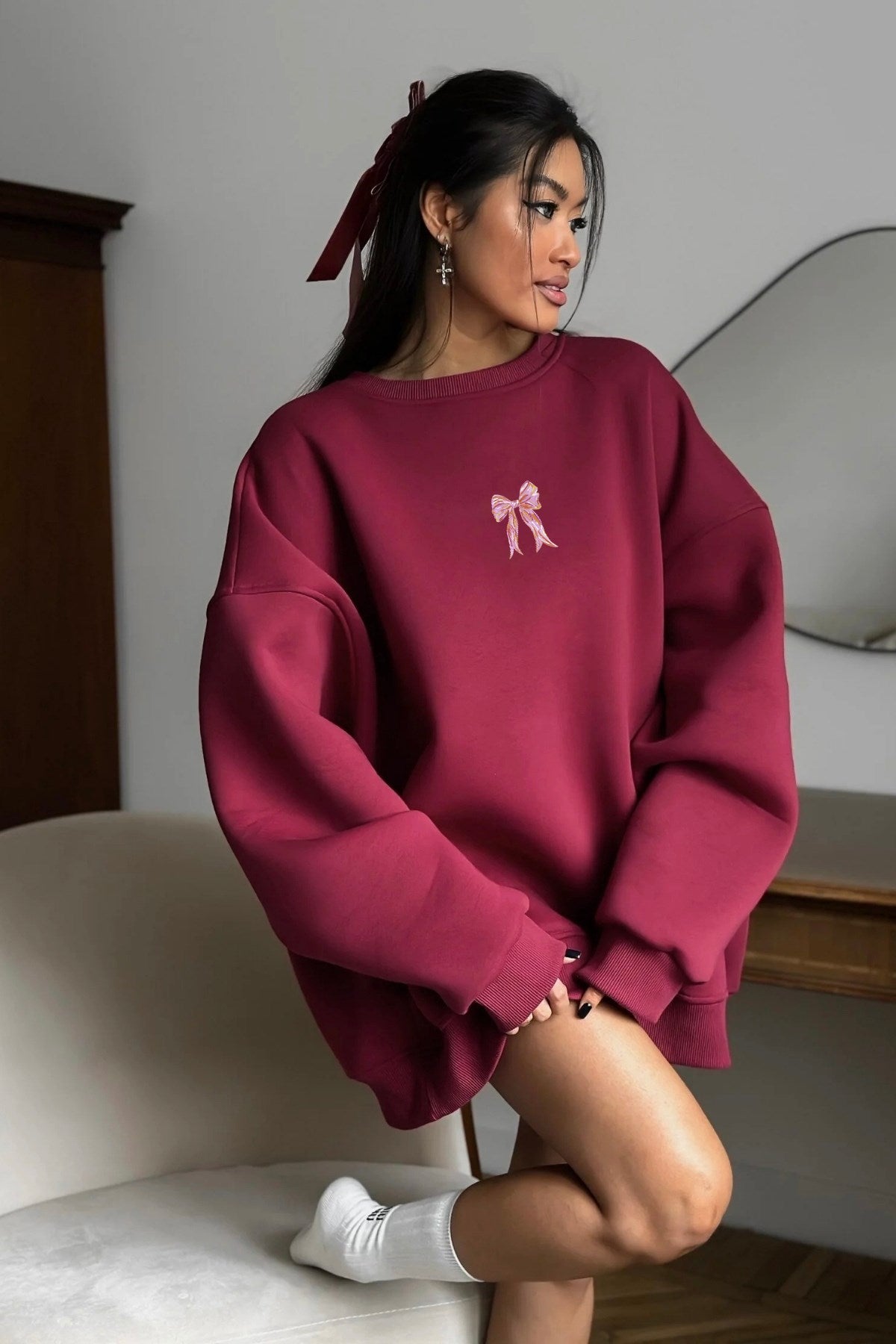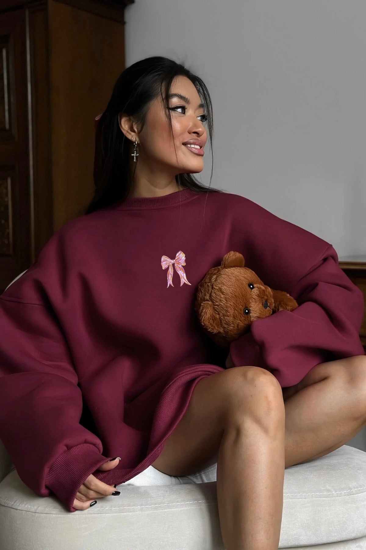 Kadın Oversize Sweat Elbise Pembe Kurdele Baskılı Bordo – Bisiklet Yaka, 3 İplik Şardonlu Polar - 2XL / BORDO