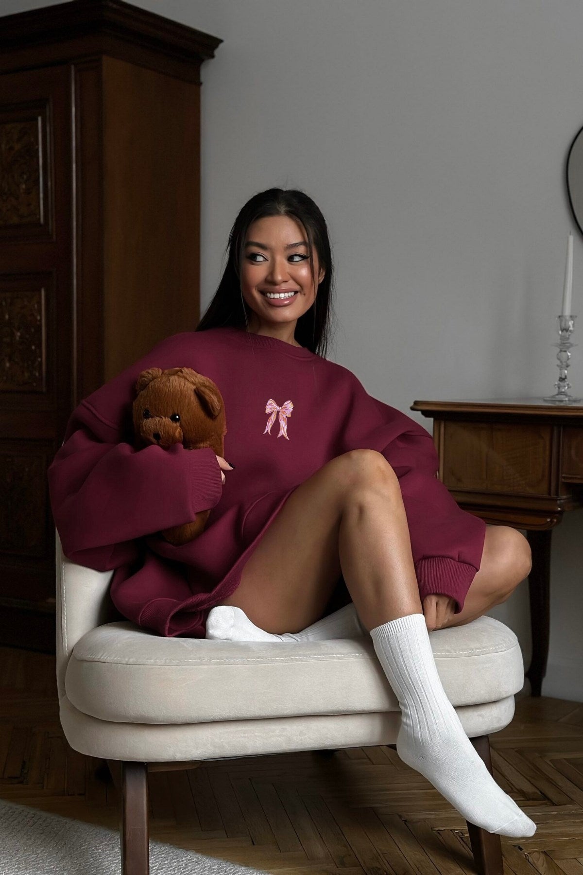 Kadın Oversize Sweat Elbise Pembe Kurdele Baskılı Bordo – Bisiklet Yaka, 3 İplik Şardonlu Polar
