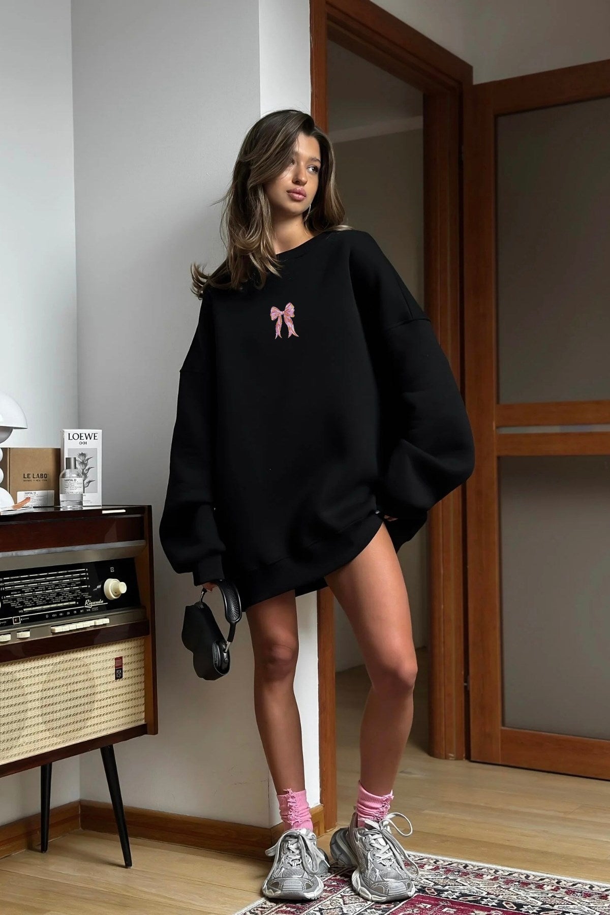 Kadın Oversize Sweat Elbise Pembe Kurdele Baskılı Siyah – Bisiklet Yaka, 3 İplik Şardonlu Polar - 2XL / SİYAH