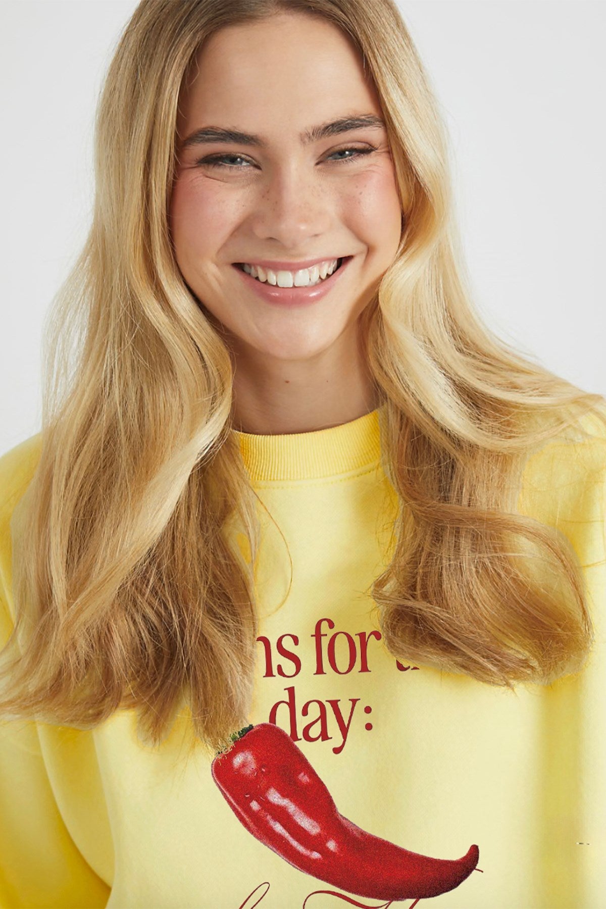 Kadın Oversize Sweatshirt Be Hot Baskılı Sarı – Bisiklet Yaka, 3 İplik Şardonlu Polar