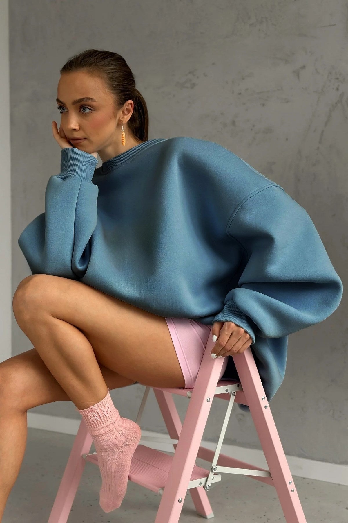 Kadın Oversize Sweatshirt Elbise Basic Marine – Bisiklet Yaka, 3 İplik Şardonlu Polar