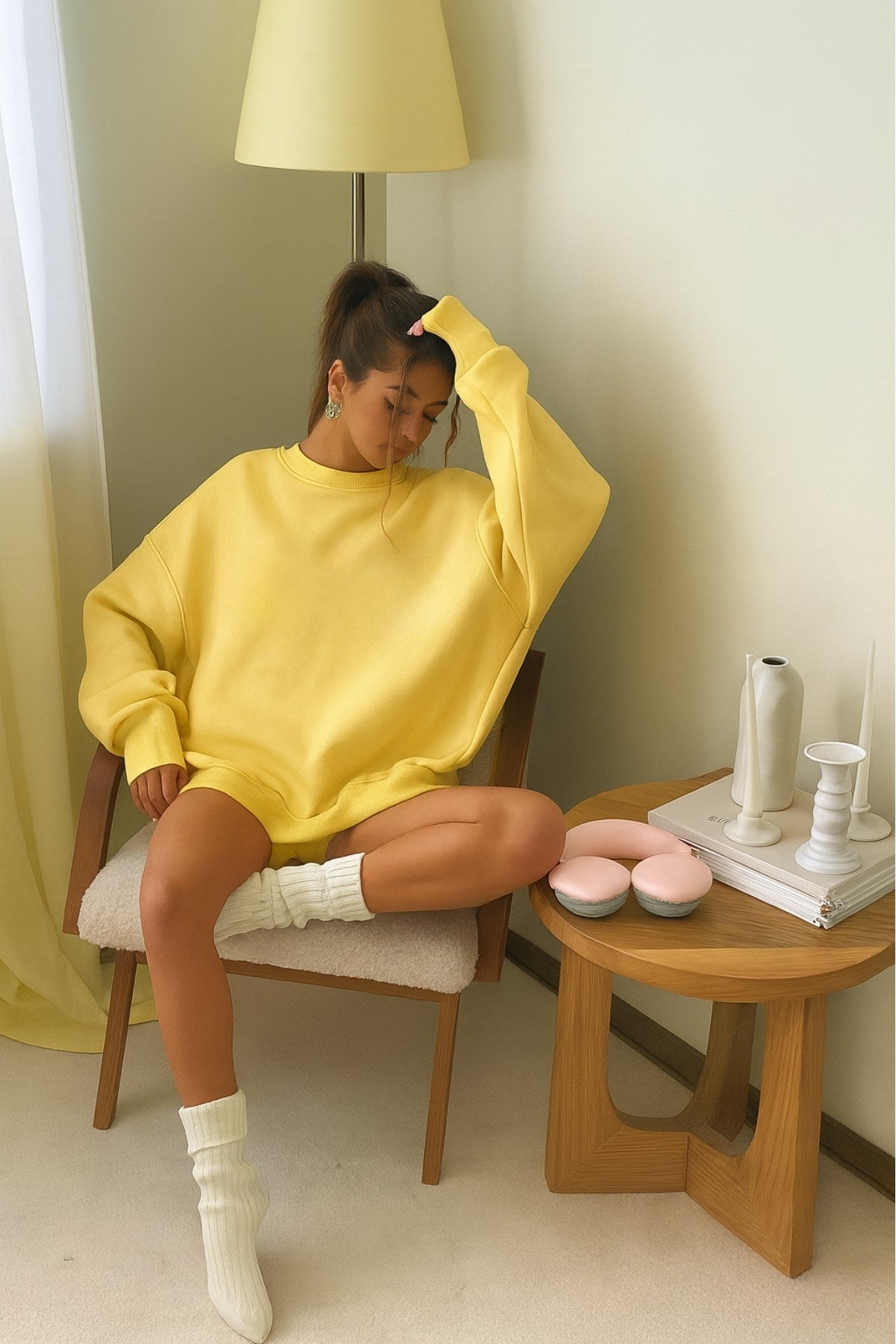 Kadın Oversize Sweatshirt Elbise Basic Sarı – Bisiklet Yaka, 3 İplik Şardonlu Polar