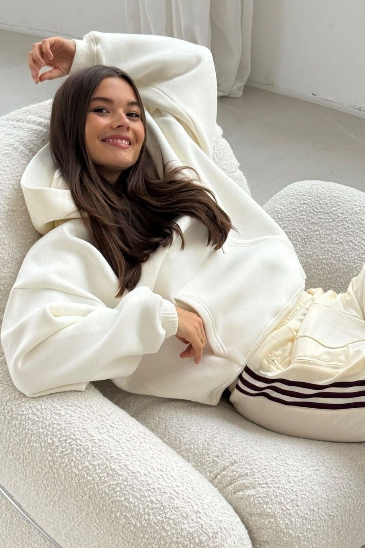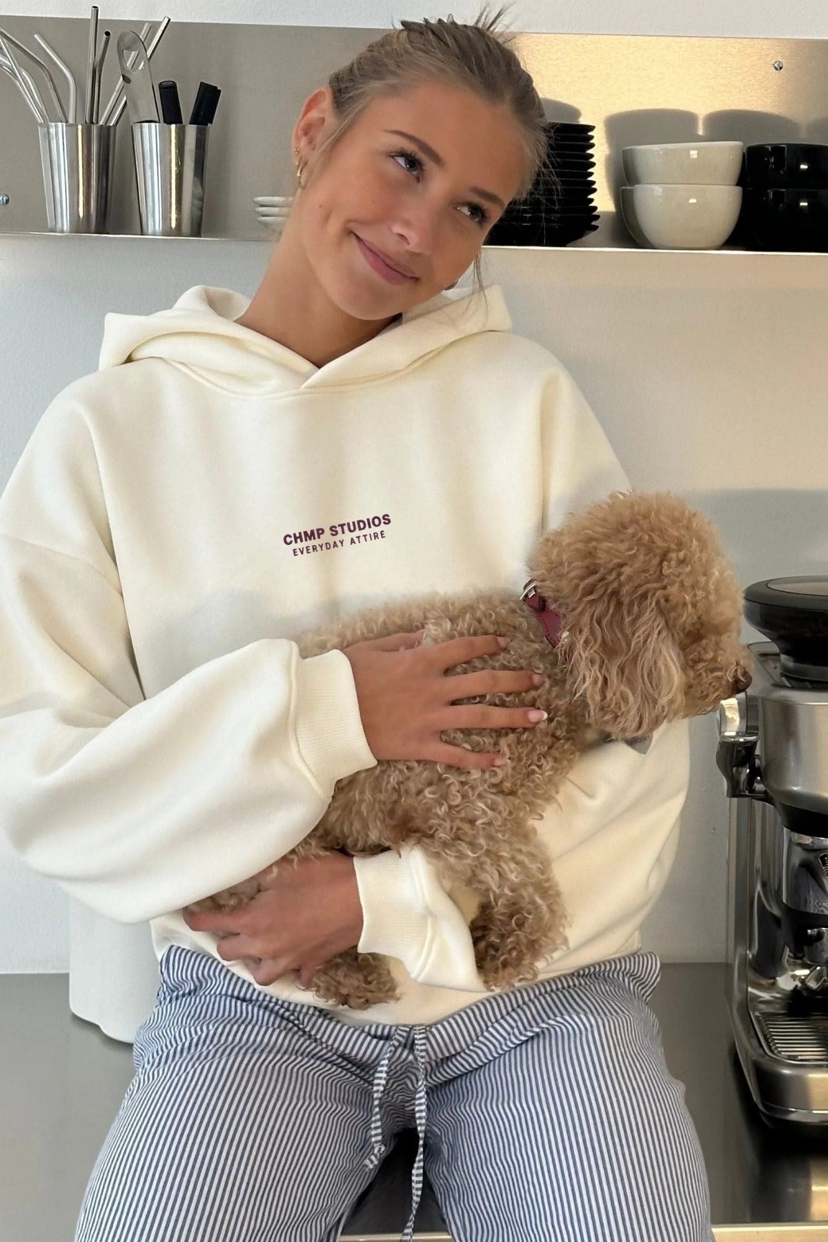 Kadın Oversize Sweatshirt Hoodie CHMP STUDIOS Beyaz – Kapüşonlu, 3 İplik Polar, Kanguru Cepli