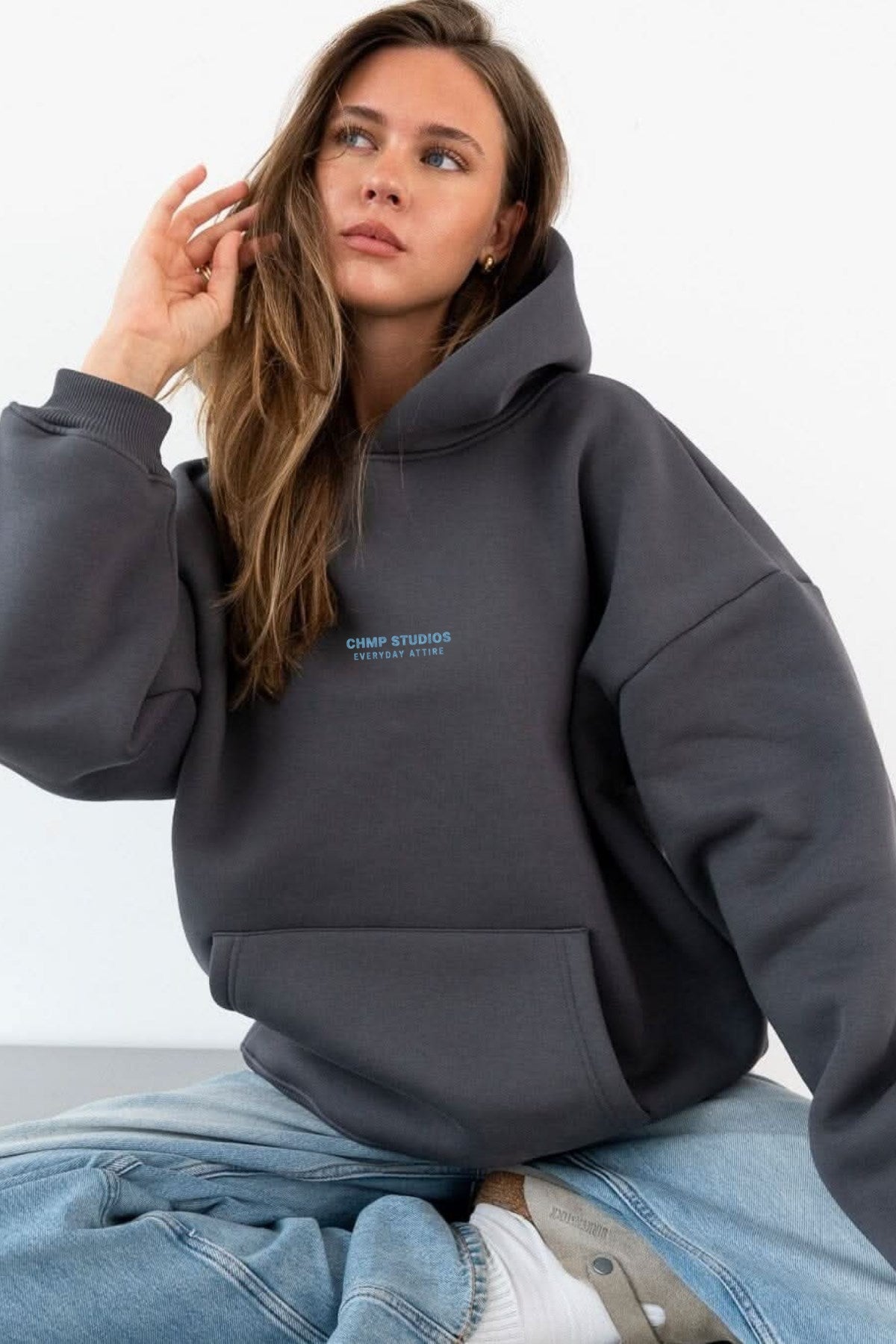 Kadın Oversize Sweatshirt Hoodie CHMP STUDIOS Füme – Kapüşonlu, 3 İplik Polar, Kanguru Cepli