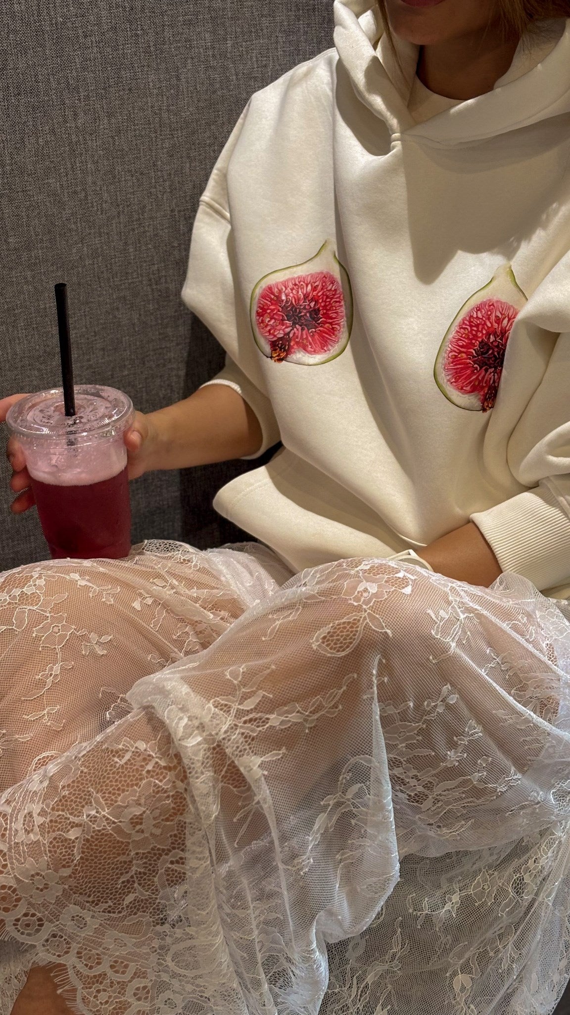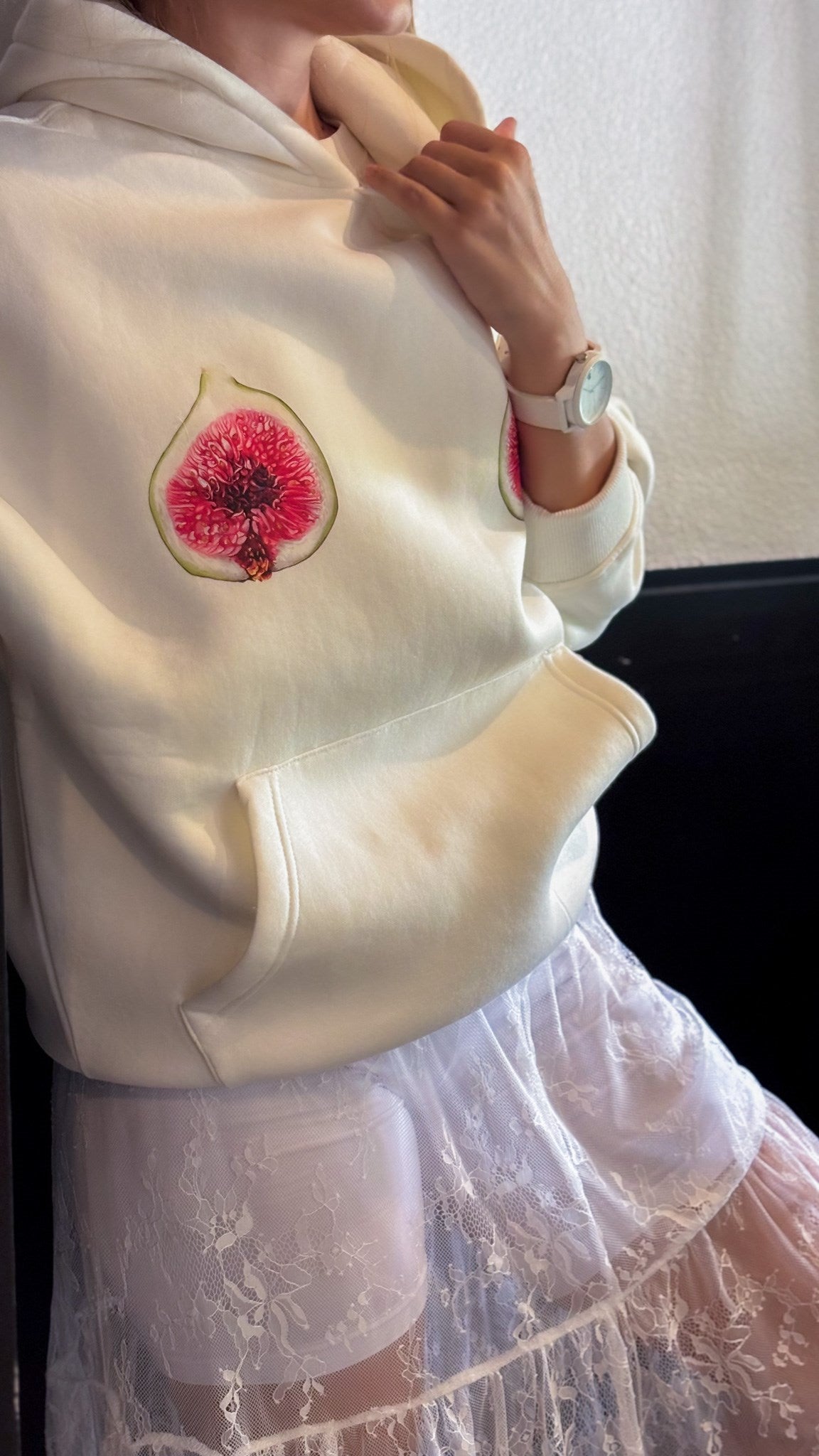 Kadın Oversize Sweatshirt Hoodie İncir Dilim Baskılı Beyaz – Kapüşonlu, Kanguru Cepli, 3 İplik Polar
