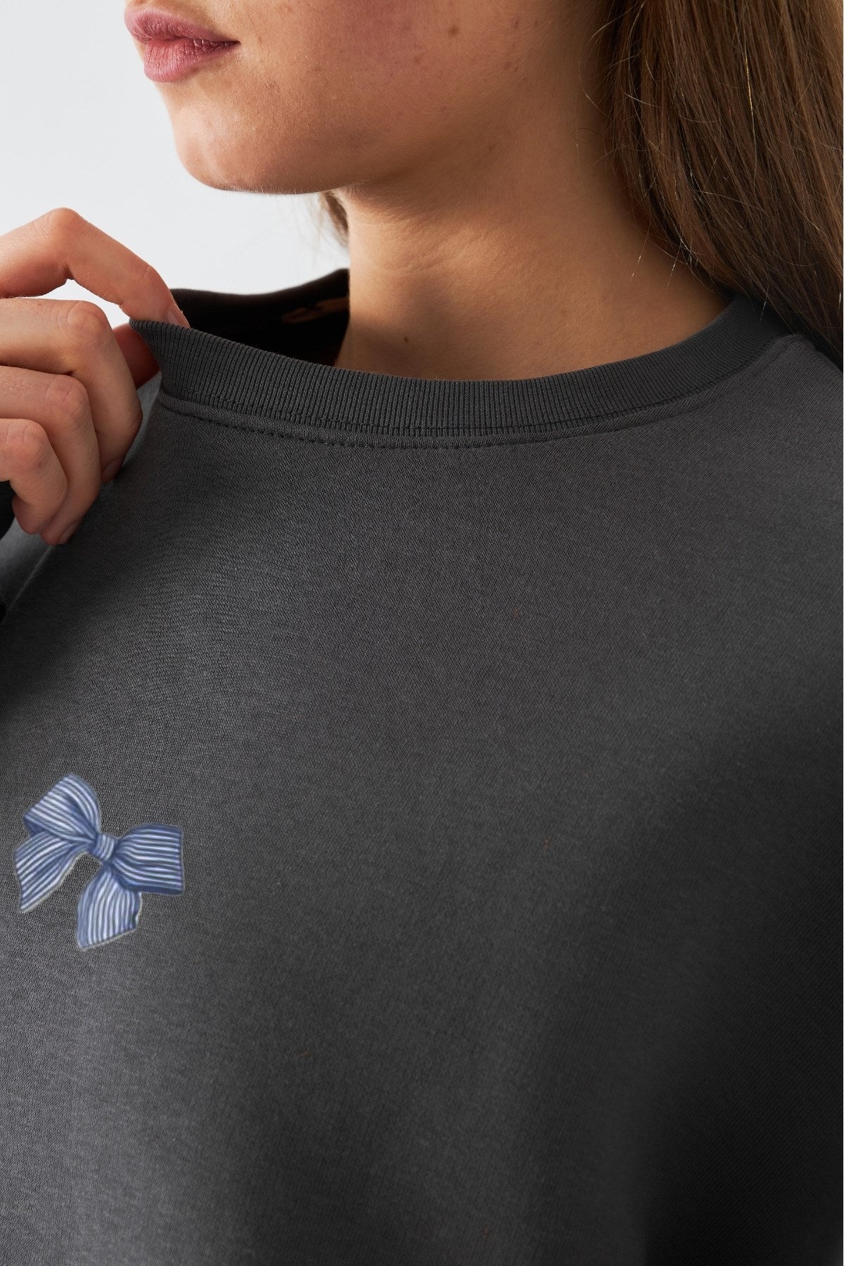 Kadın Oversize Sweatshirt How Lucky Are We Baskılı Füme– Bisiklet Yaka, 3 İplik Şardonlu Polar