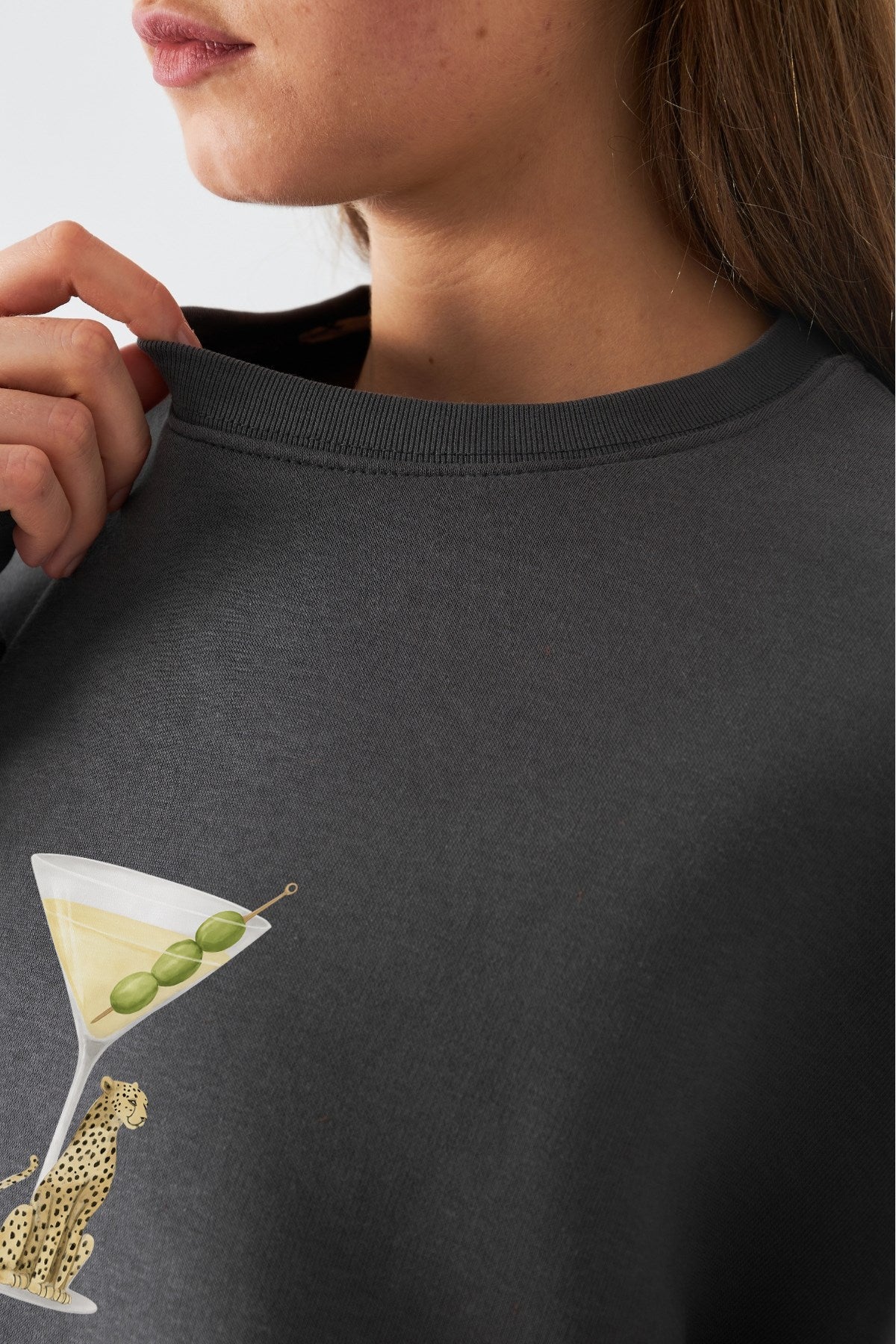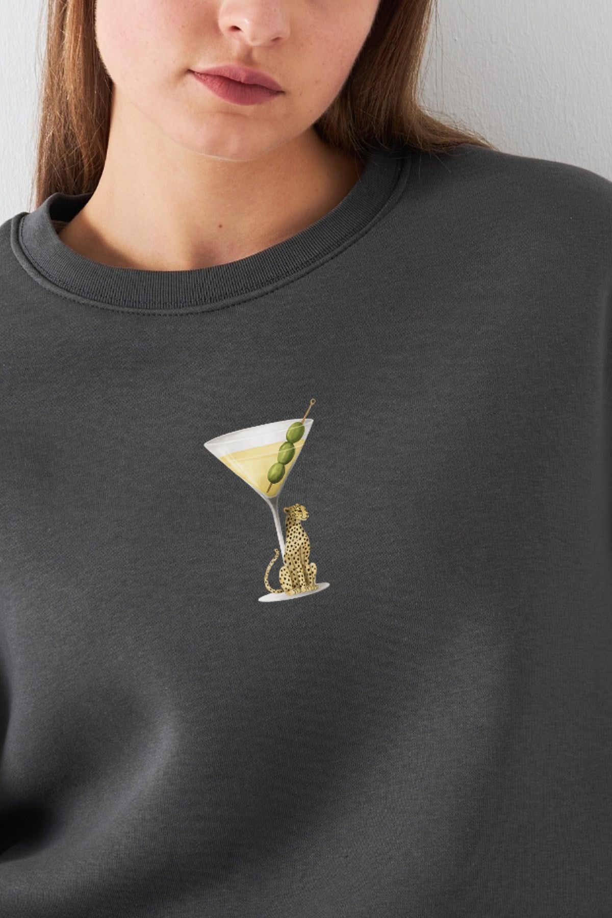 Zamansız The Champ Martini Leopard Sweatshirt, minimal tasarımı sofistike bir dokunuşla buluşturuyor. Göğüs kısmındaki martini bardağı ve leopar figürü baskısı, modern şehir stiline özgü zarif bir kontrast oluşturur.