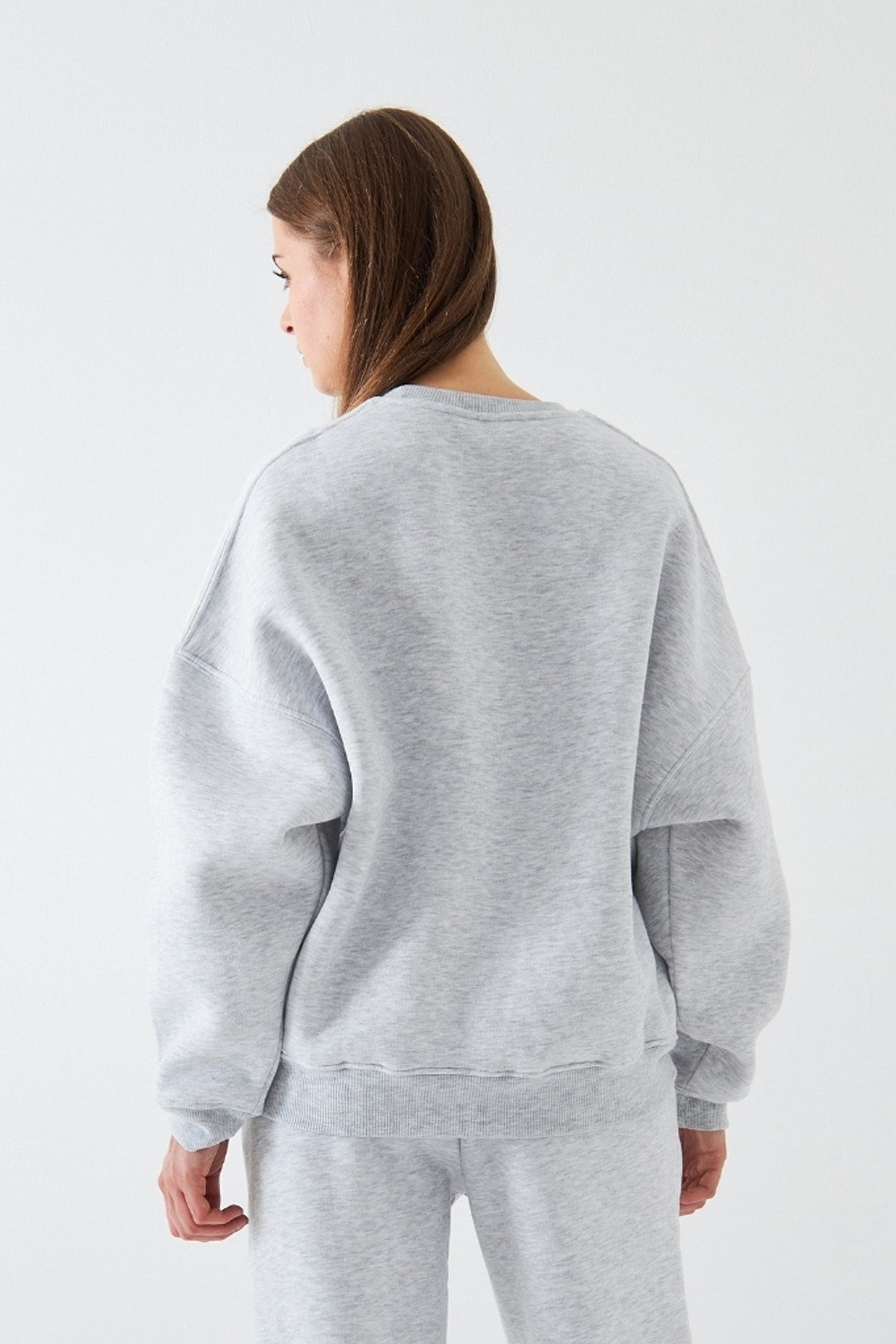 Kadın Oversize Sweatshirt Martini Leopard Baskılı Gri Melanj – Bisiklet Yaka, 3 İplik Şardonlu Polar