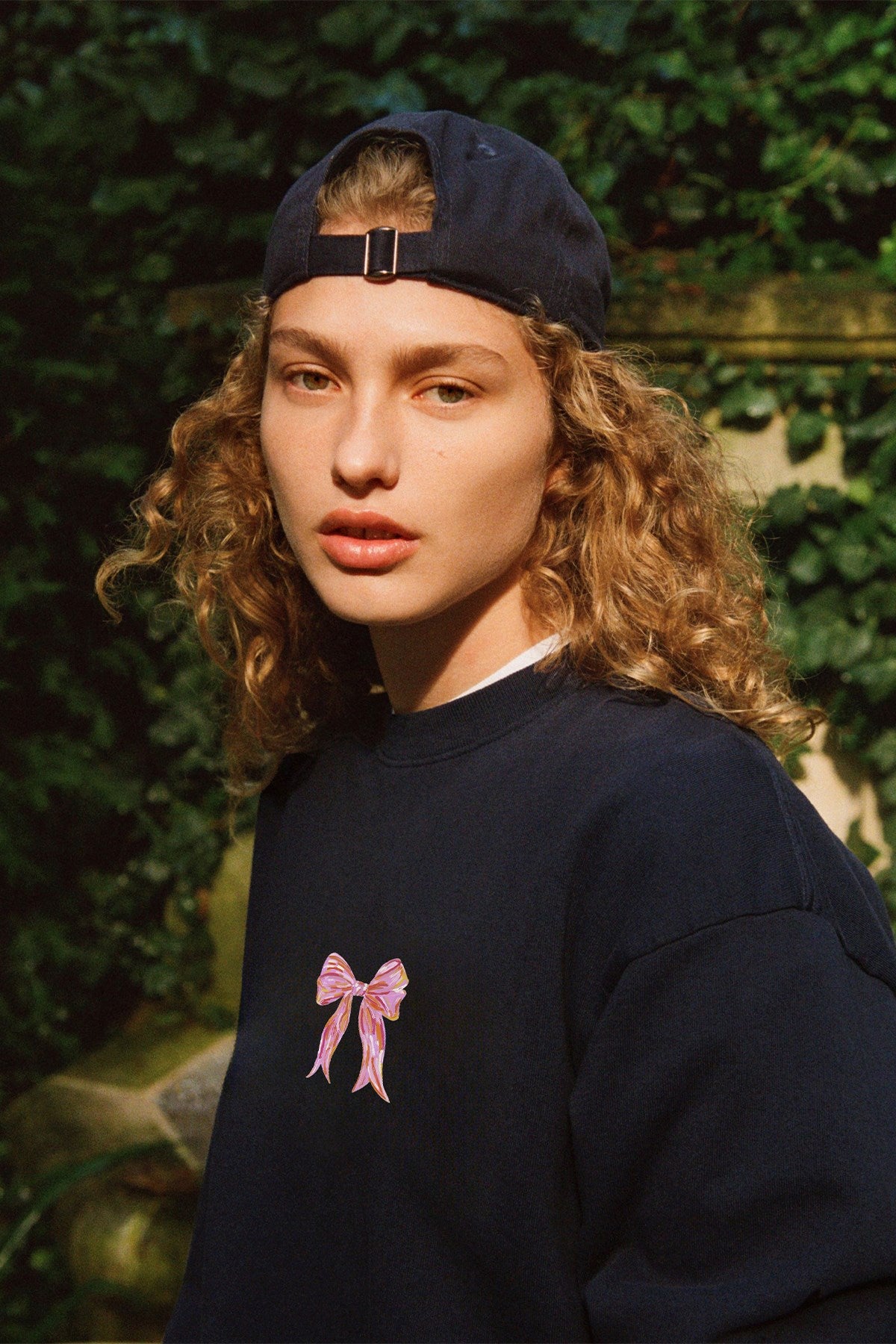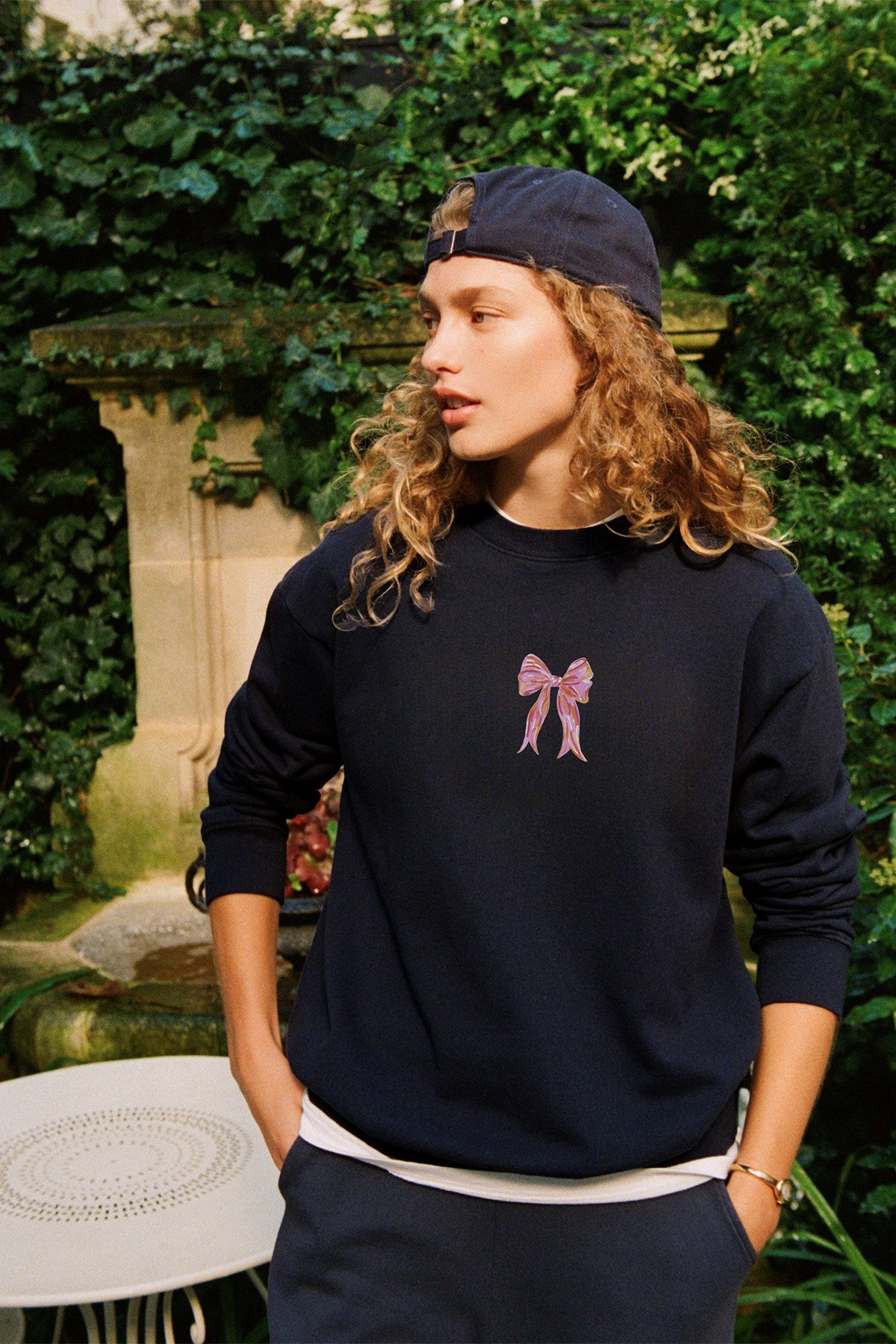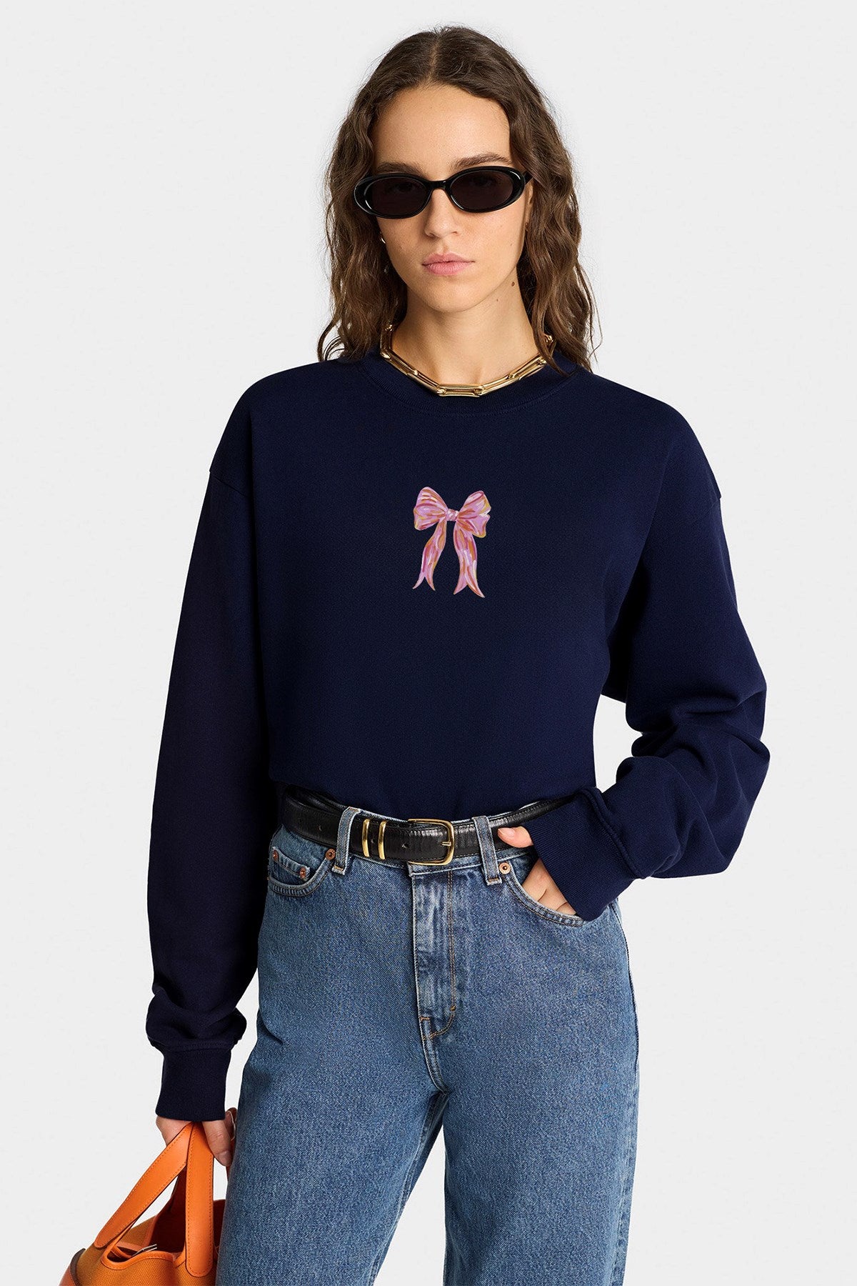 Kadın Oversize Sweatshirt Pembe Kurdele Baskılı Lacivert – Bisiklet Yaka, 3 İplik Şardonlu Polar