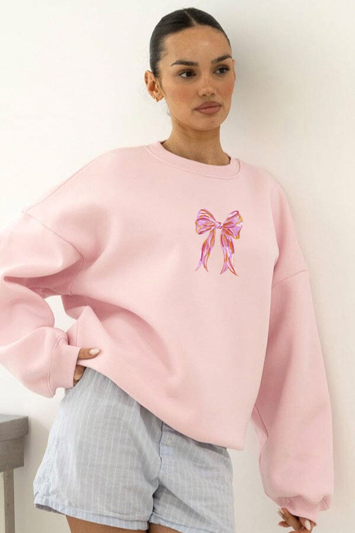 Kadın Oversize Sweatshirt Pembe Kurdele Baskılı Pembe – Bisiklet Yaka, 3 İplik Şardonlu Polar