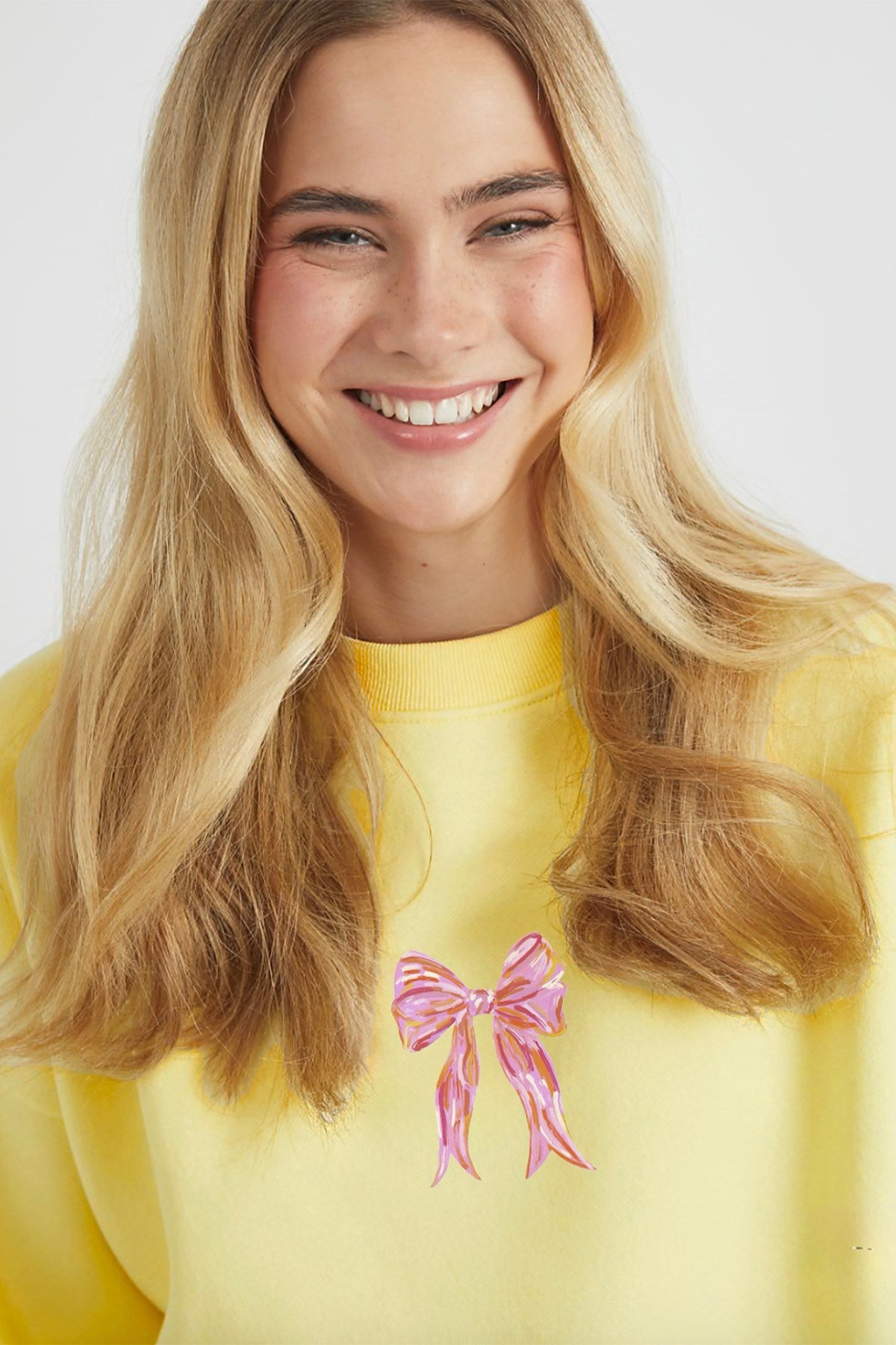 Kadın Oversize Sweatshirt Pembe Kurdele Baskılı Sarı – Bisiklet Yaka, 3 İplik Şardonlu Polar - 2XL / SARI