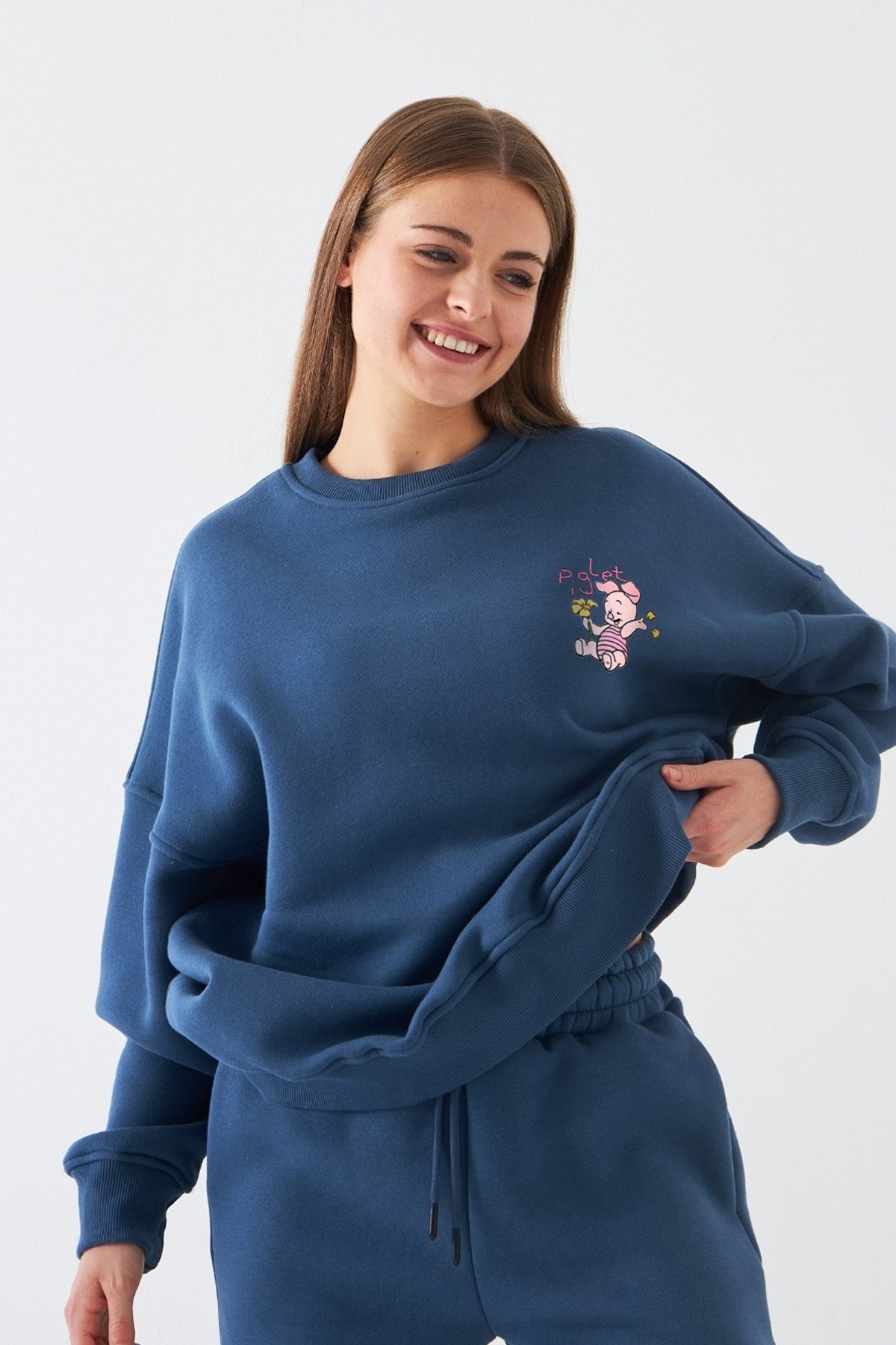 Kadın Oversize Sweatshirt Piglet Bloom Baskılı Marine – Bisiklet Yaka, 3 İplik Şardonlu Polar