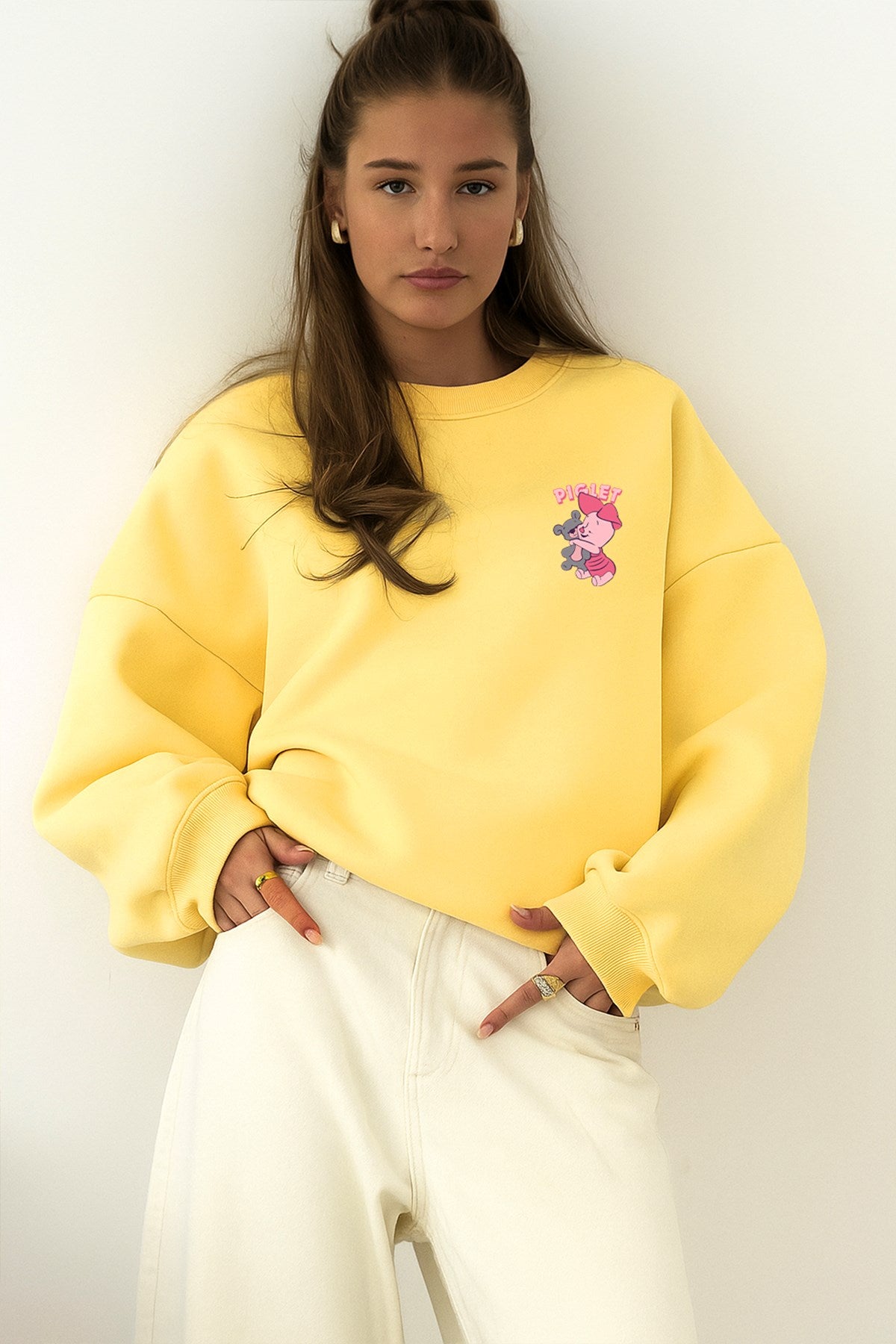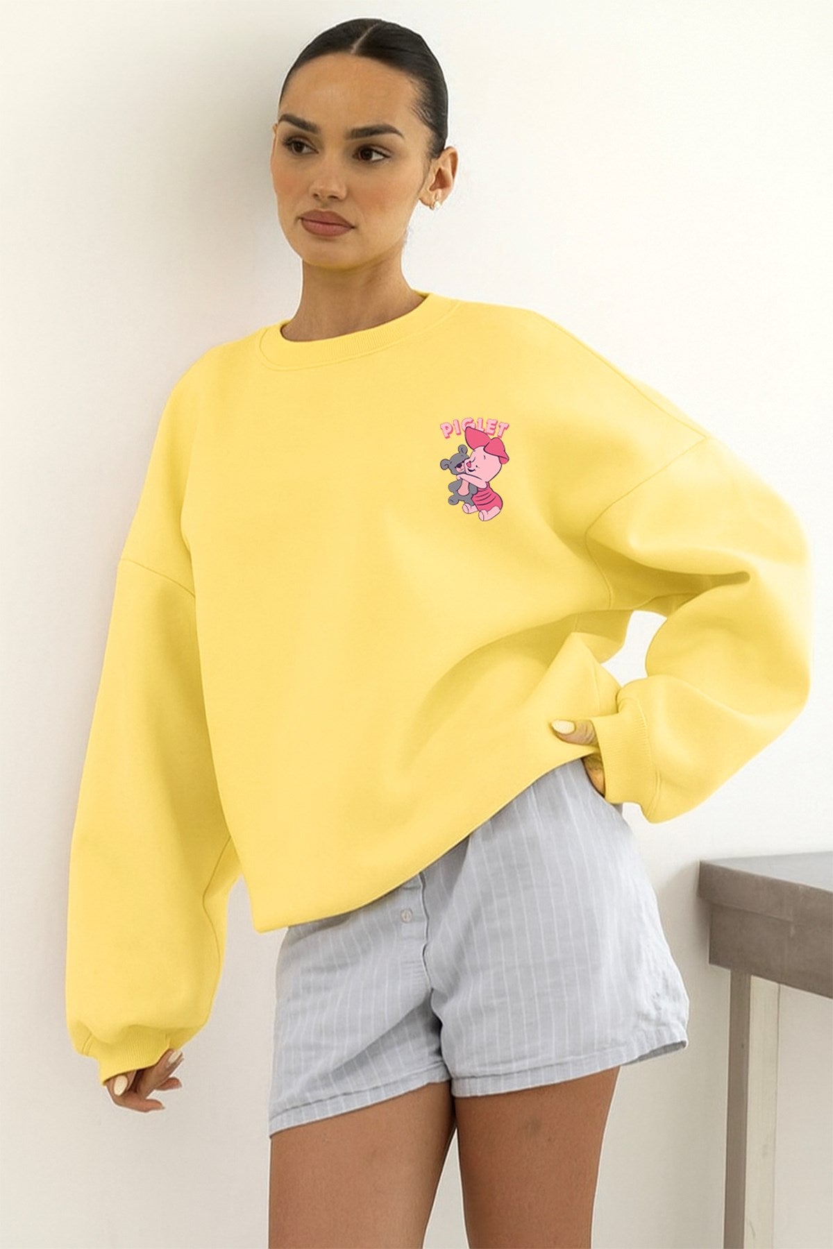 Kadın Oversize Sweatshirt Piglet Hugs Baskılı Sarı – Bisiklet Yaka, 3 İplik Şardonlu Polar