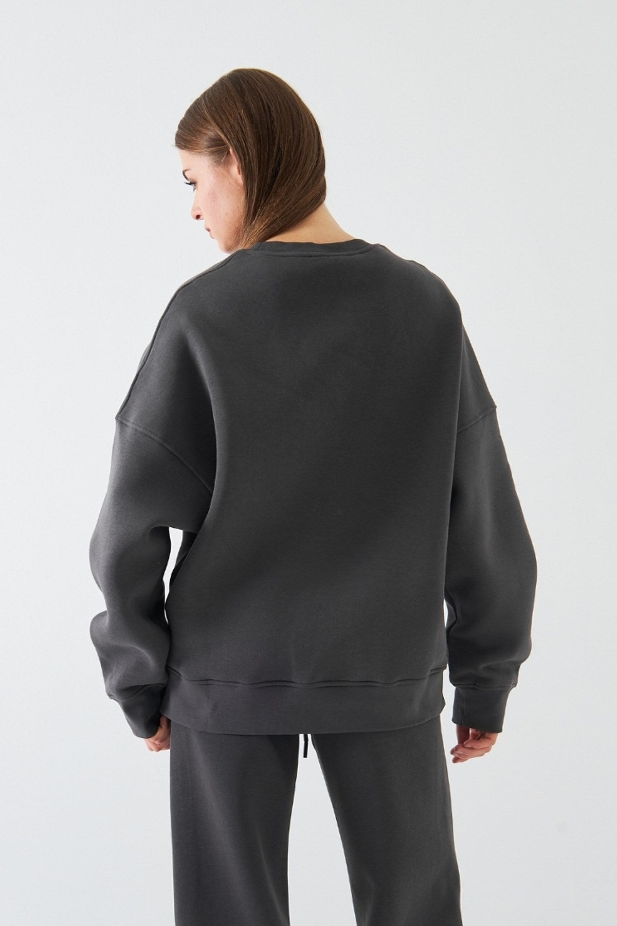 Kadın Oversize Sweatshirt Sun & Moon Baskılı Füme – Bisiklet Yaka, 3 İplik Şardonlu Polar