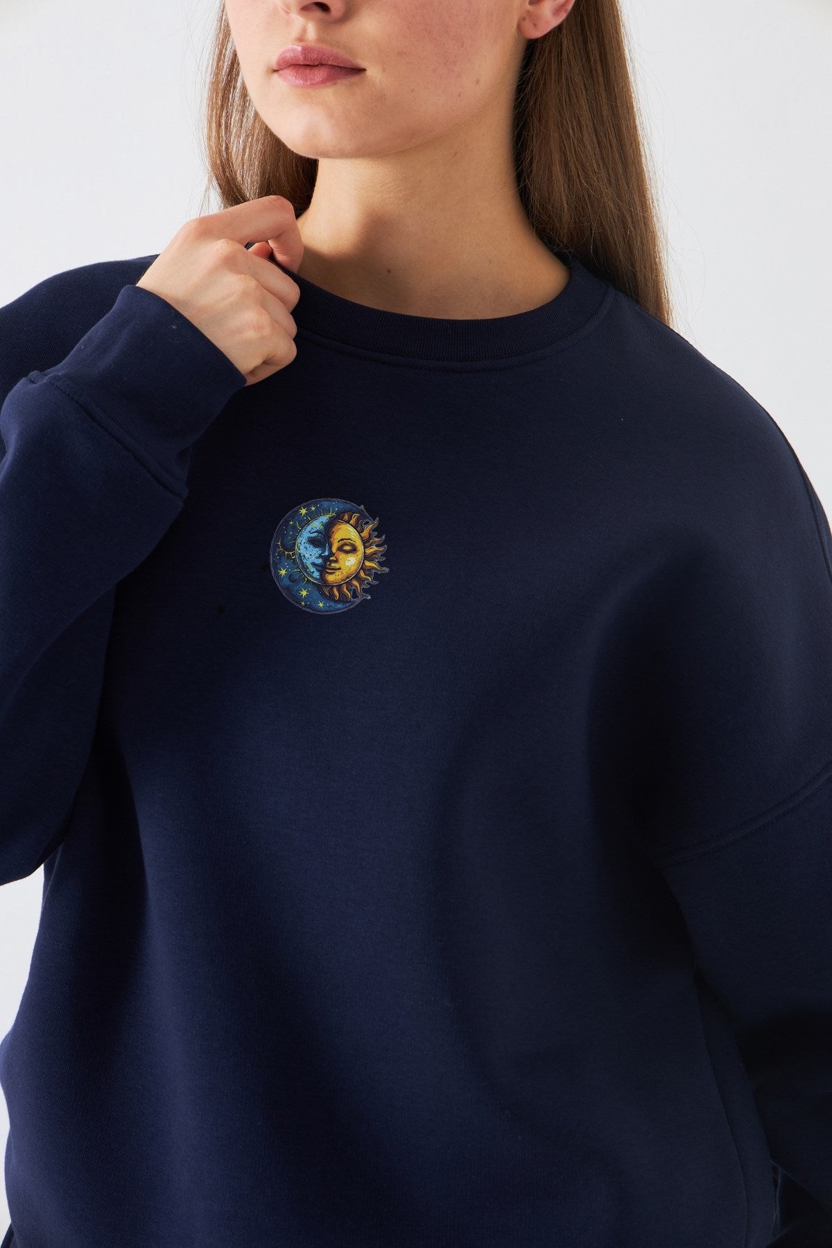Kadın Oversize Sweatshirt Sun & Moon Baskılı Lacivert – Bisiklet Yaka, 3 İplik Şardonlu Polar
