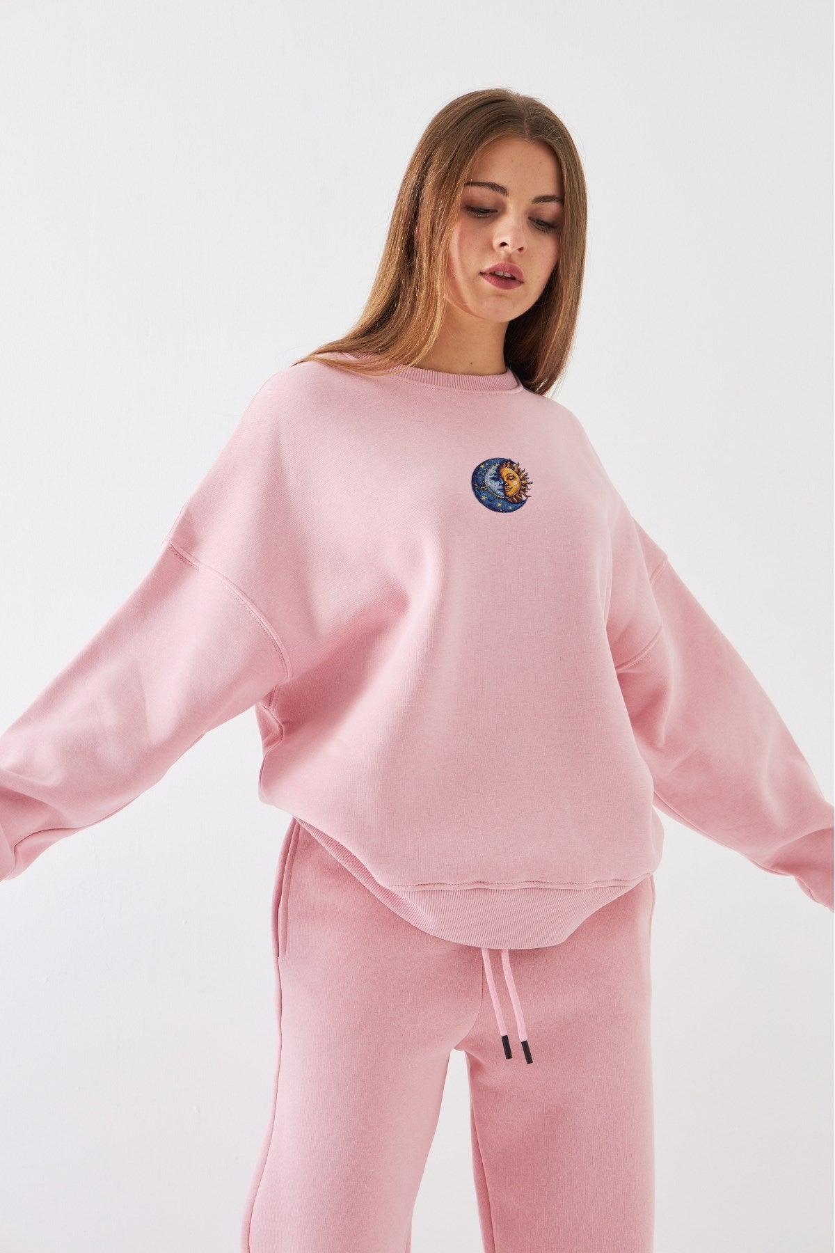 Kadın Oversize Sweatshirt Sun & Moon Baskılı Pembe – Bisiklet Yaka, 3 İplik Şardonlu Polar