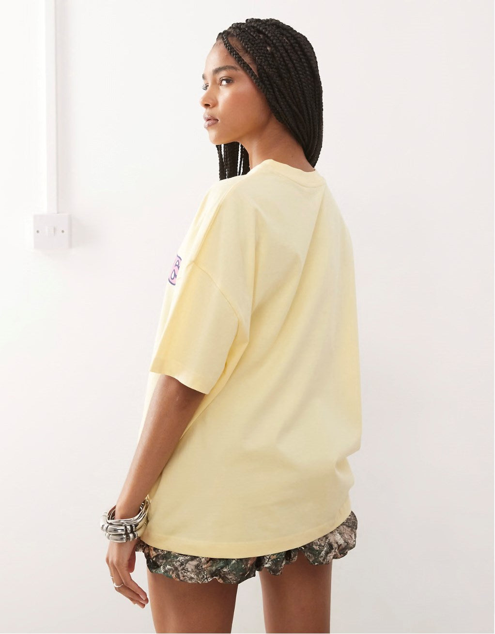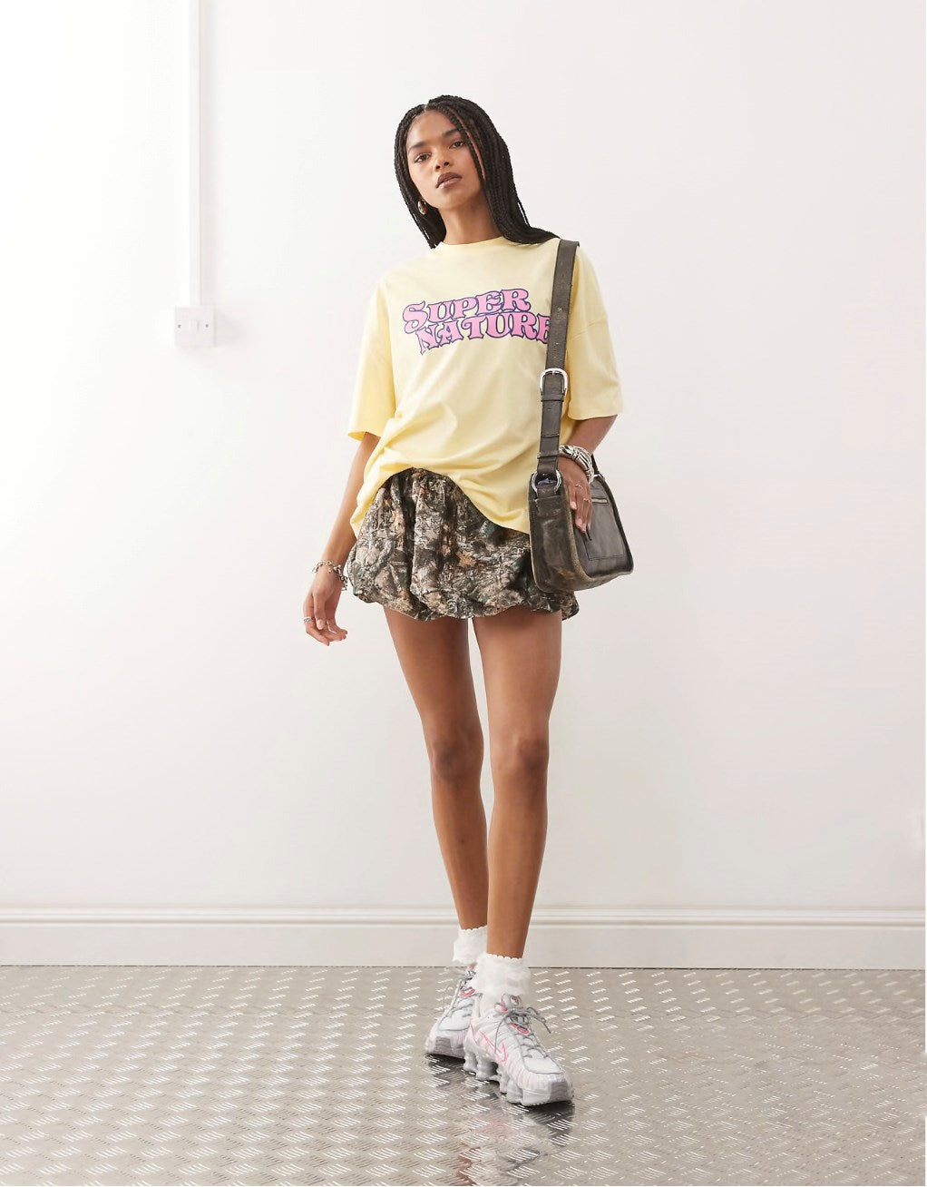 Kadın Oversize Tişört – Pembe Yazı Baskılı Super Nature Tasarım - SARI / XS