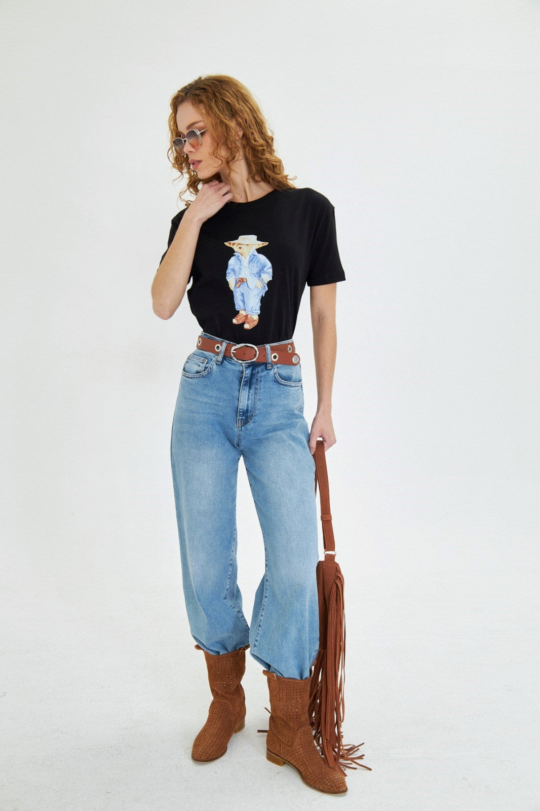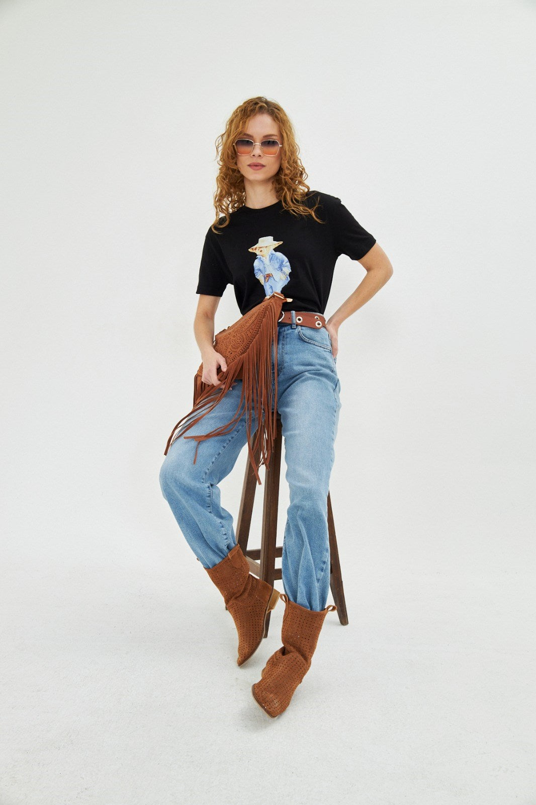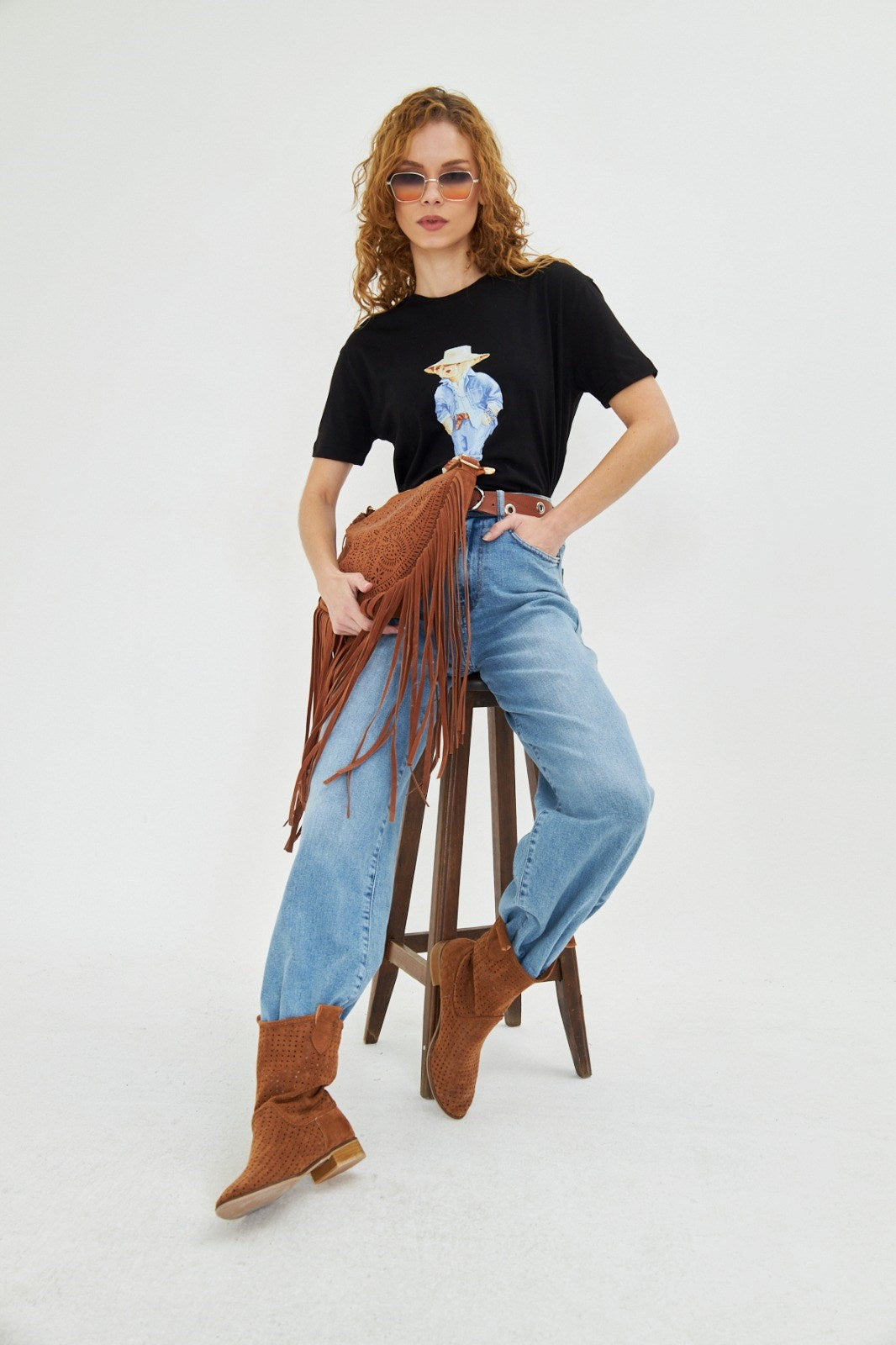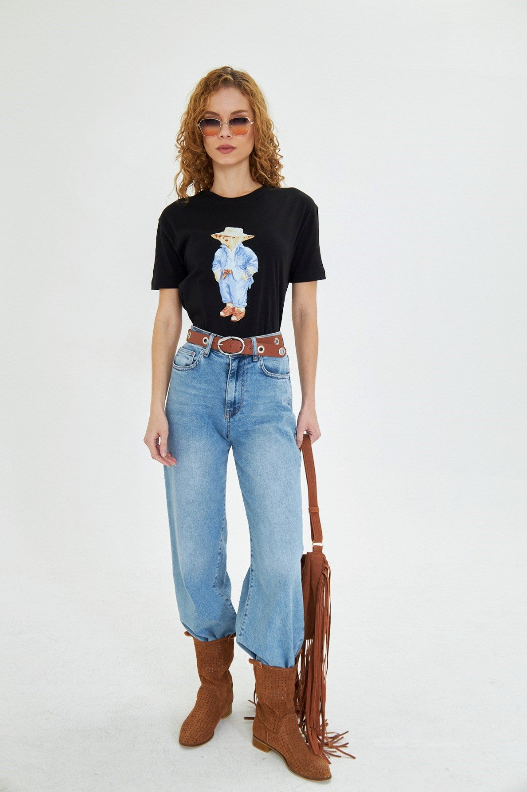 Yeni sezonun trendleri arasında yer alan bu kadın siyah oversize baskılı tişört, tarzınızı eğlenceli ve modern bir dokunuşla tamamlar. Ön kısmında yer alan şapkalı çizgi karakter deseni ile sıradan tişörtlerden ayrılır. Yumuşak ve kaliteli pamuklu kumaşı sayesinde gün boyu konfor sağlar. Oversize kesimi ile hareket özgürlüğü sunar ve her vücut tipine uygundur.