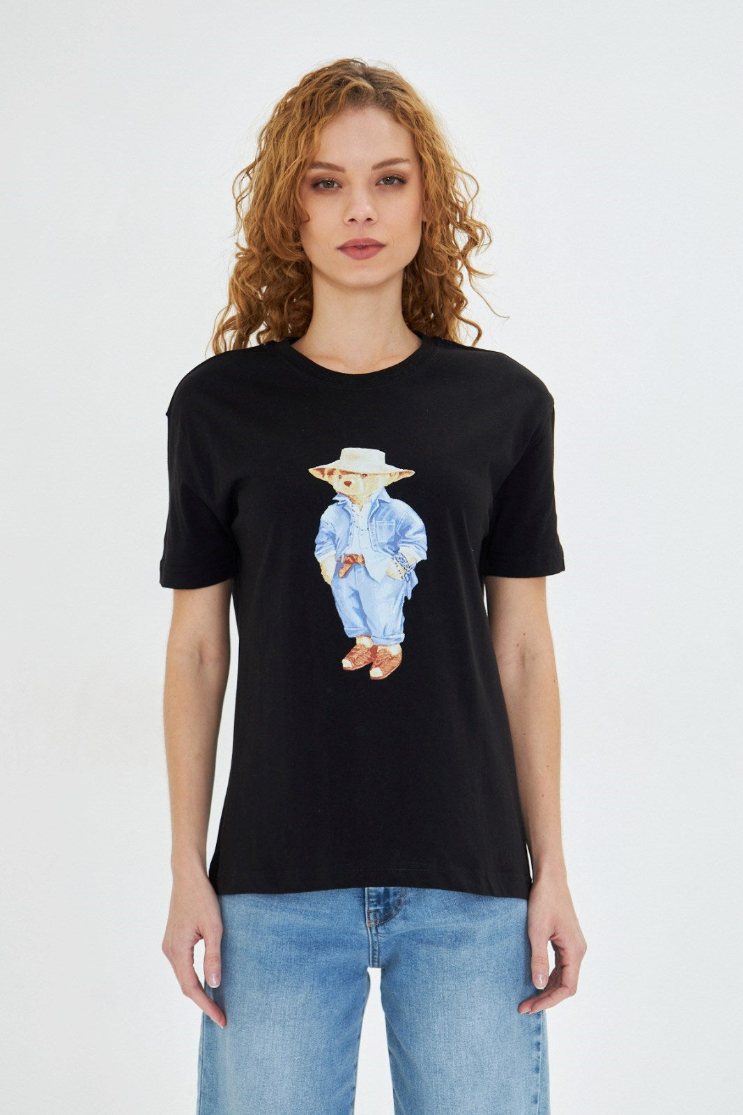 Kadın Siyah Oversize Baskılı Tişört – Şapkalı Çizgi Karakter Desenli Rahat Model