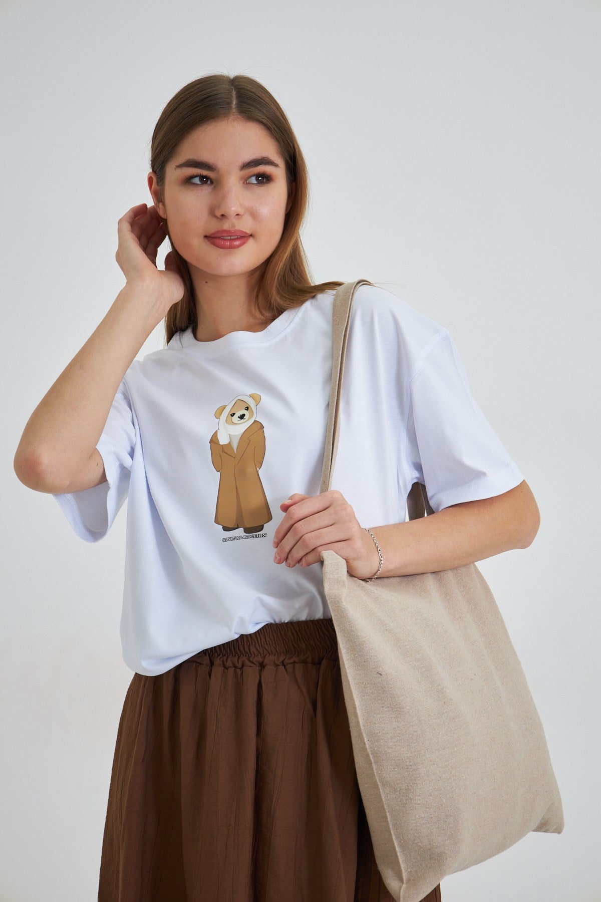 Ön kısmındaki uzun kaban giymiş sevimli ayıcık baskısı ile fark yaratırken, “Special Edition” yazısı bu tişörtü koleksiyonluk bir parçaya dönüştürüyor.