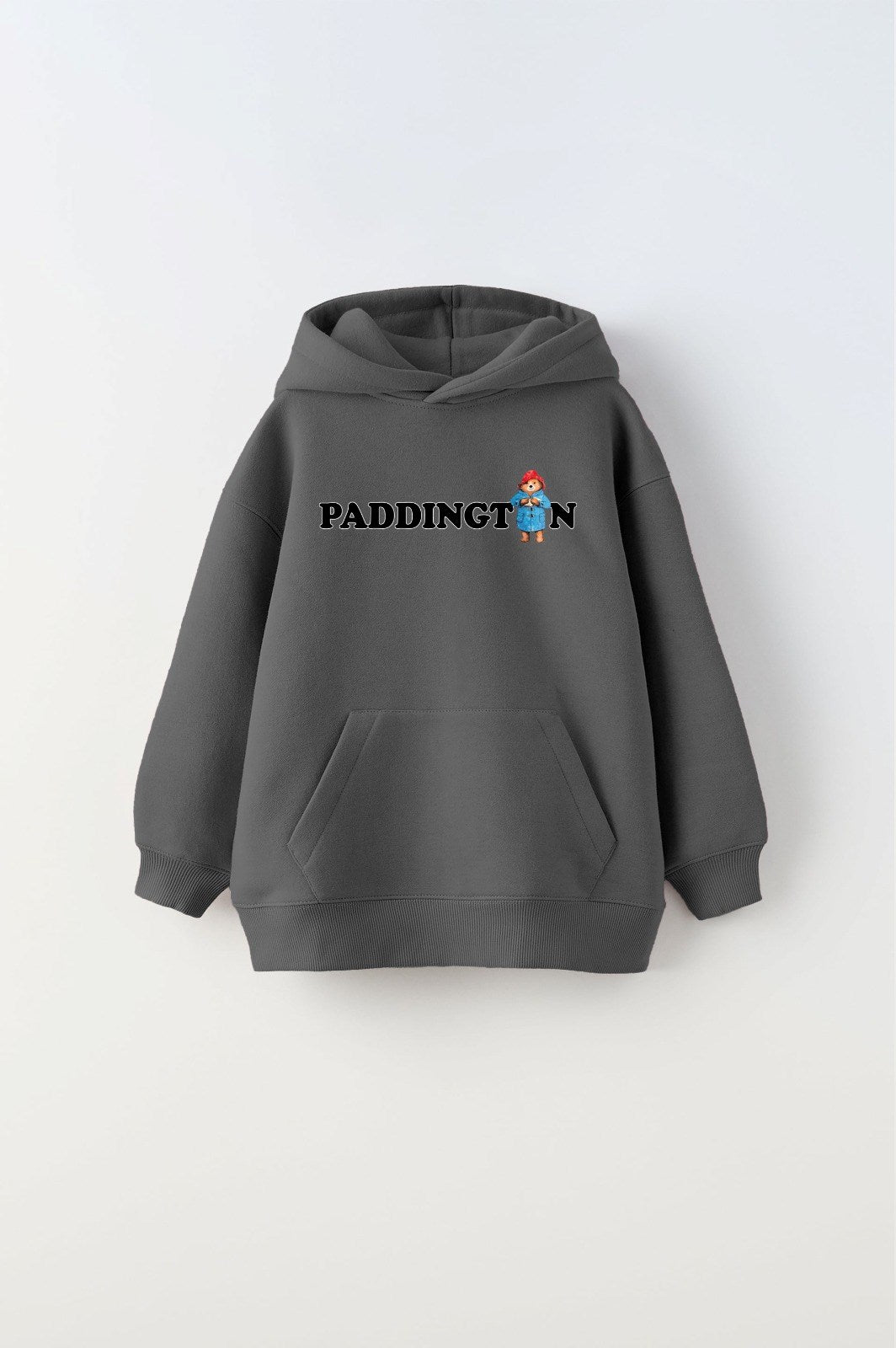 Kapüşonlu İçi Polar Paddington Yazılı Ayı Figür Baskılı Füme Unisex Çocuk Sweatshirt