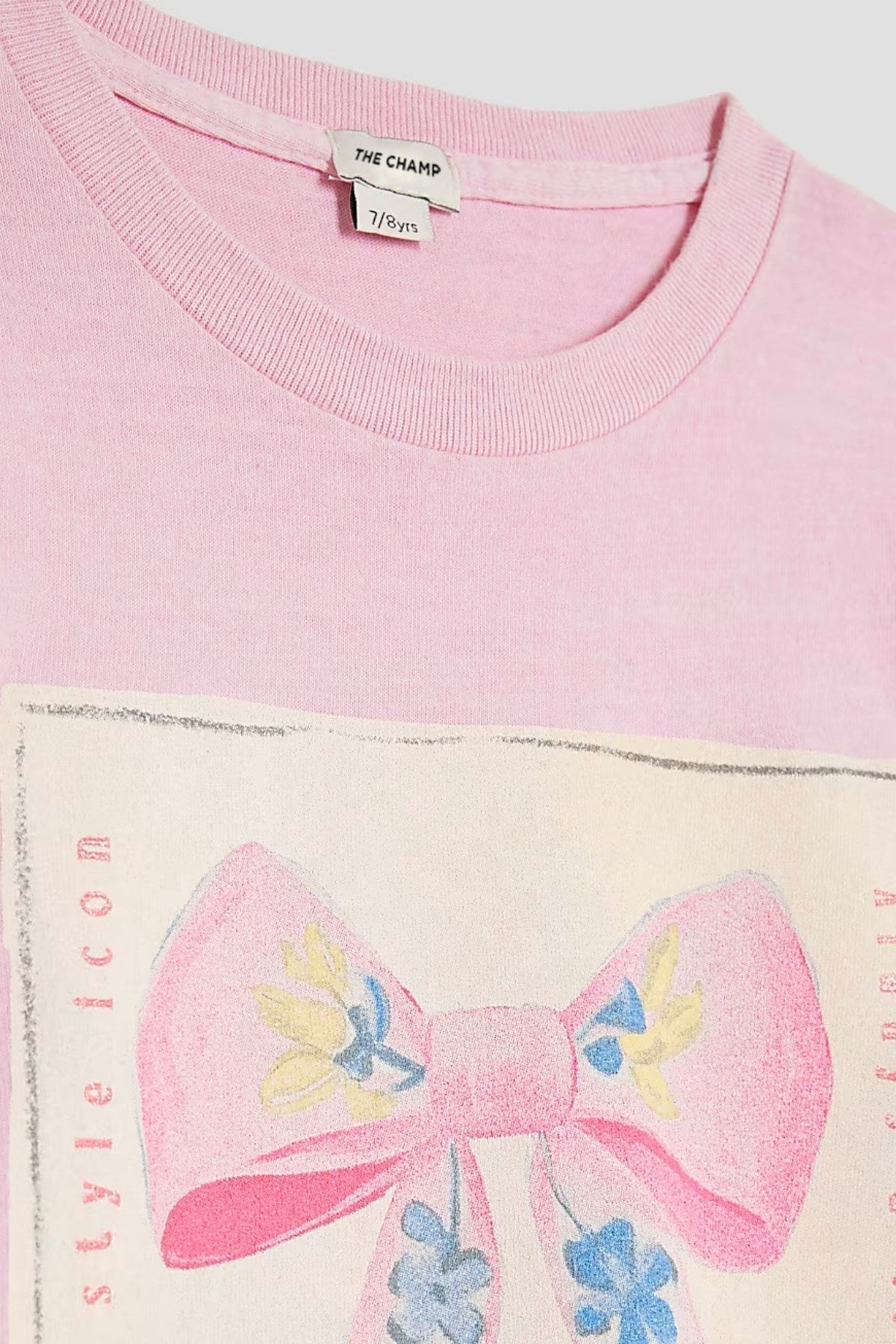 Kız Çocuk Pembe Fiyonk Baskılı Tişört – Très Chic Yazılı Pamuklu